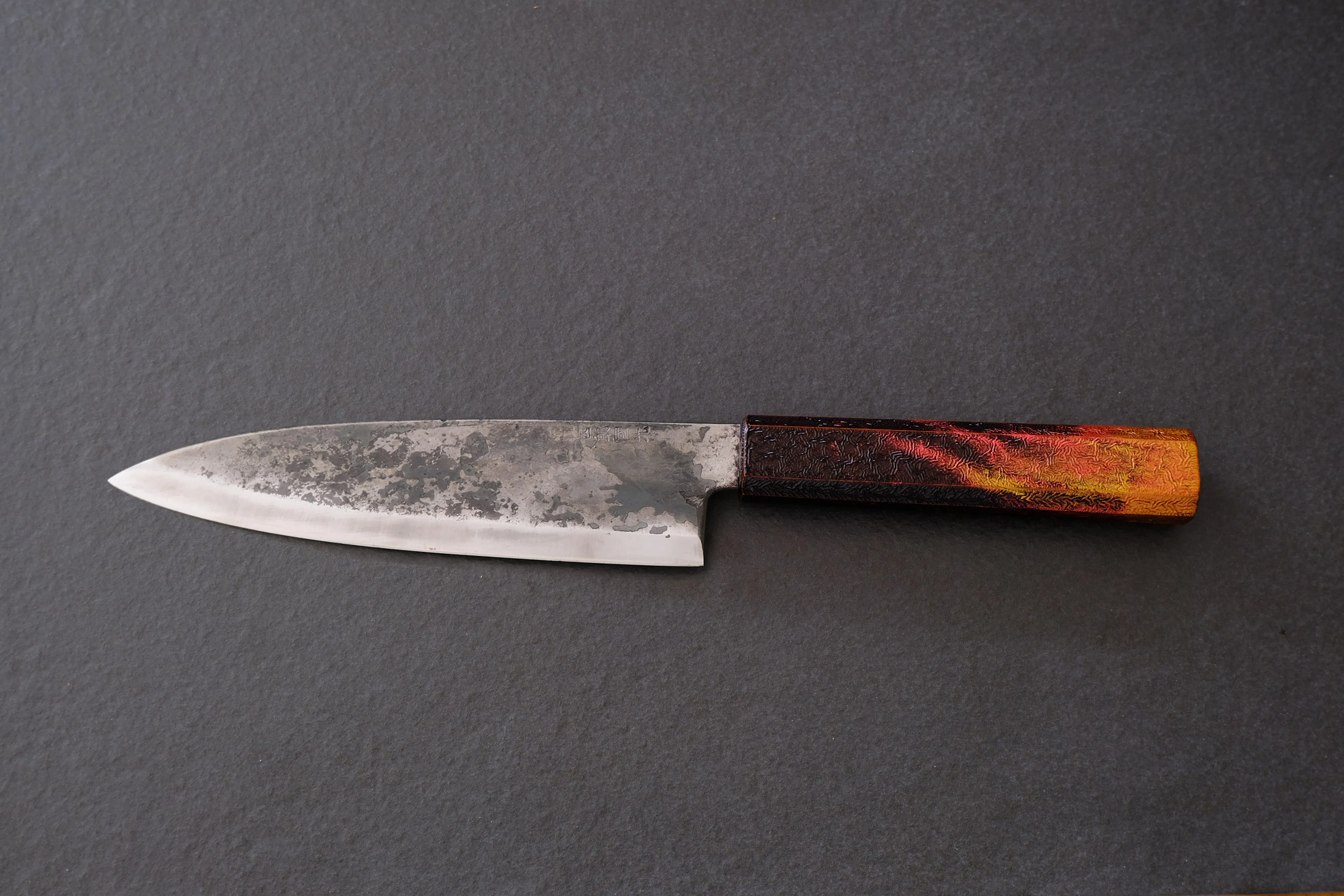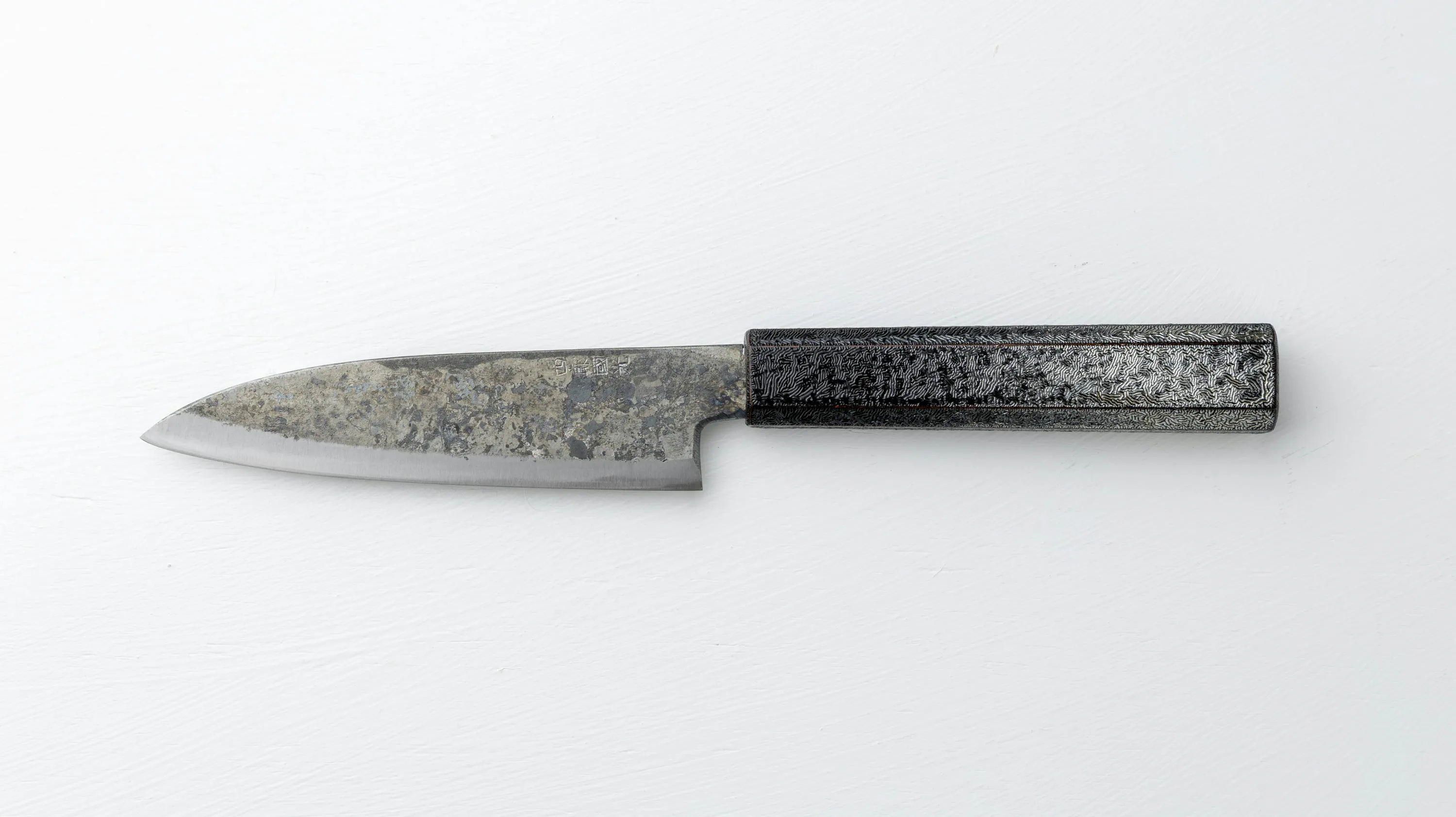 この「KUROUCHI」の名前の通り包丁表面の黒い部分は加熱時などで生成される酸化被膜です。その被膜をそのまま残した包丁を「黒打包丁」と呼びます。被膜を残すことにより錆びにくくなり手入れがしやすくなります。また独特の風合いが生まれ、無骨で美しい刃物に仕上がります。