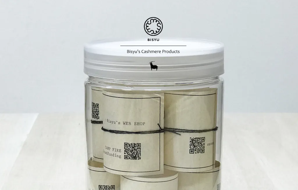 カシミヤ糸で止めた、QRコード印刷入りのPRカード、とっても評判良かったです!(笑)