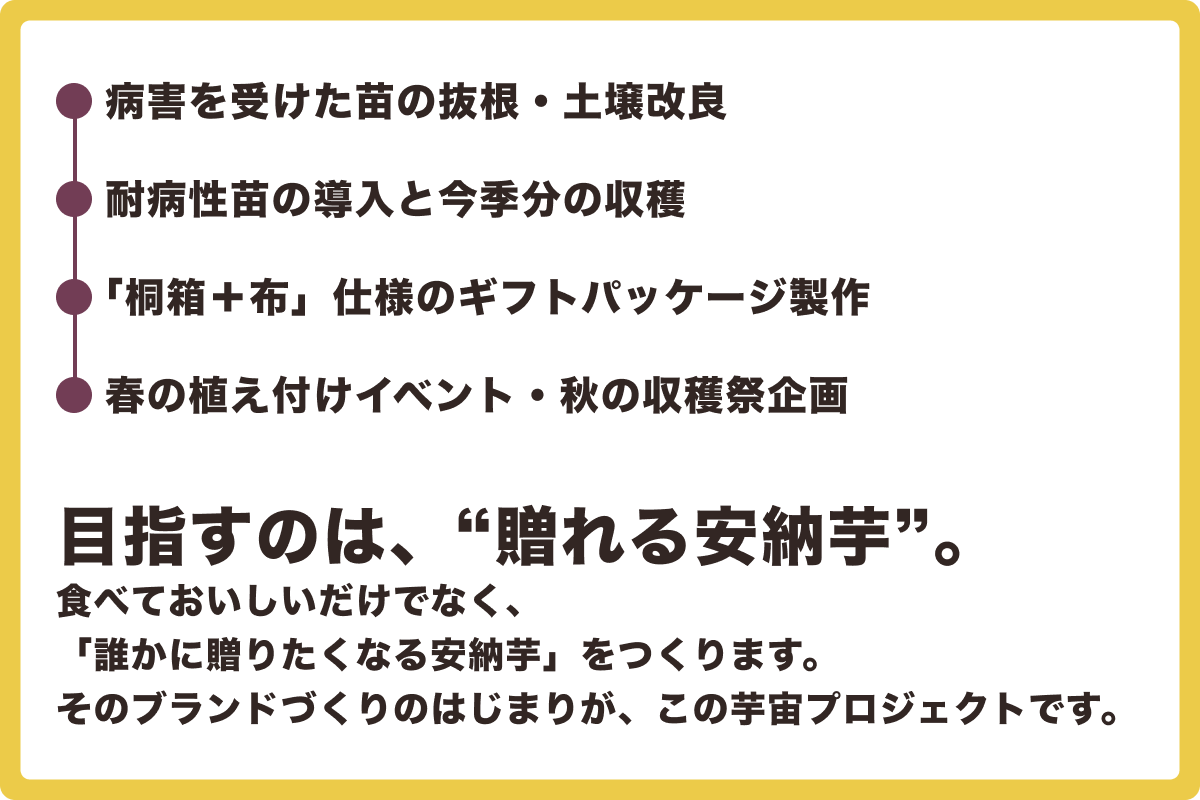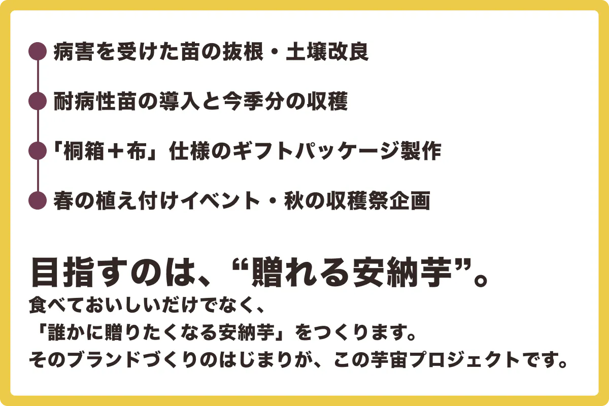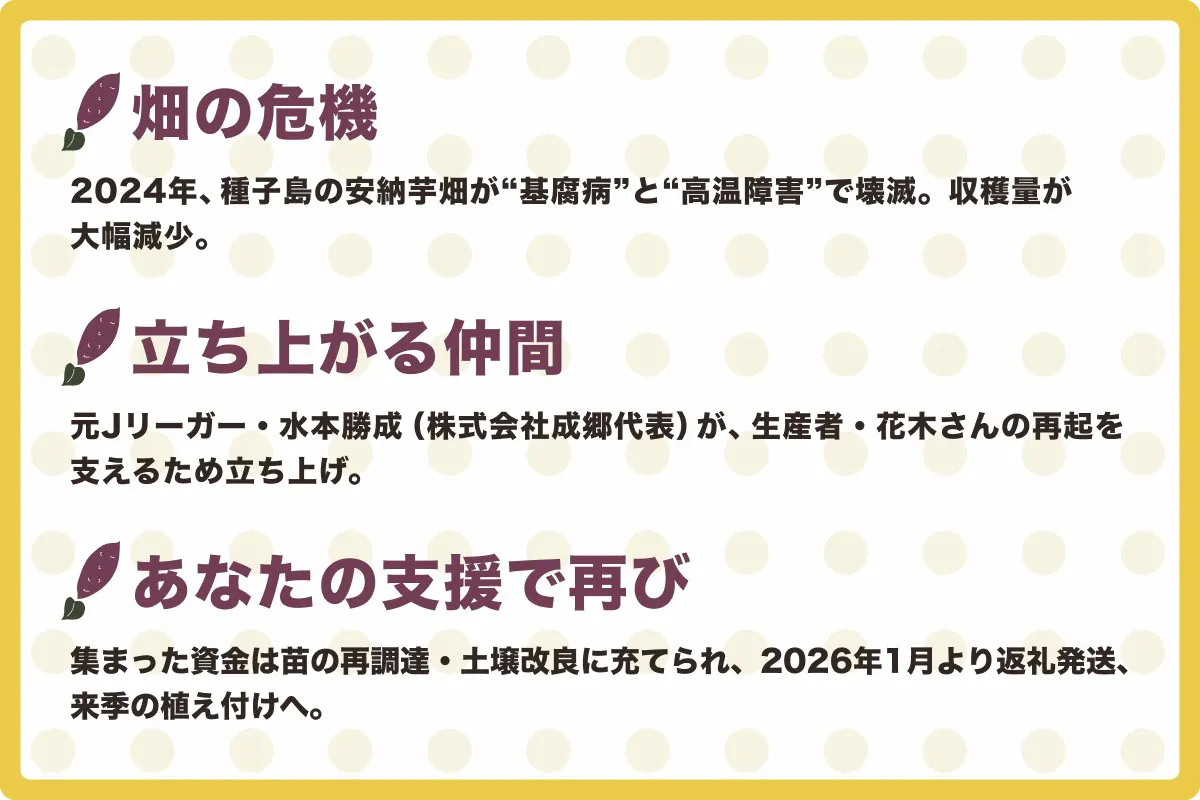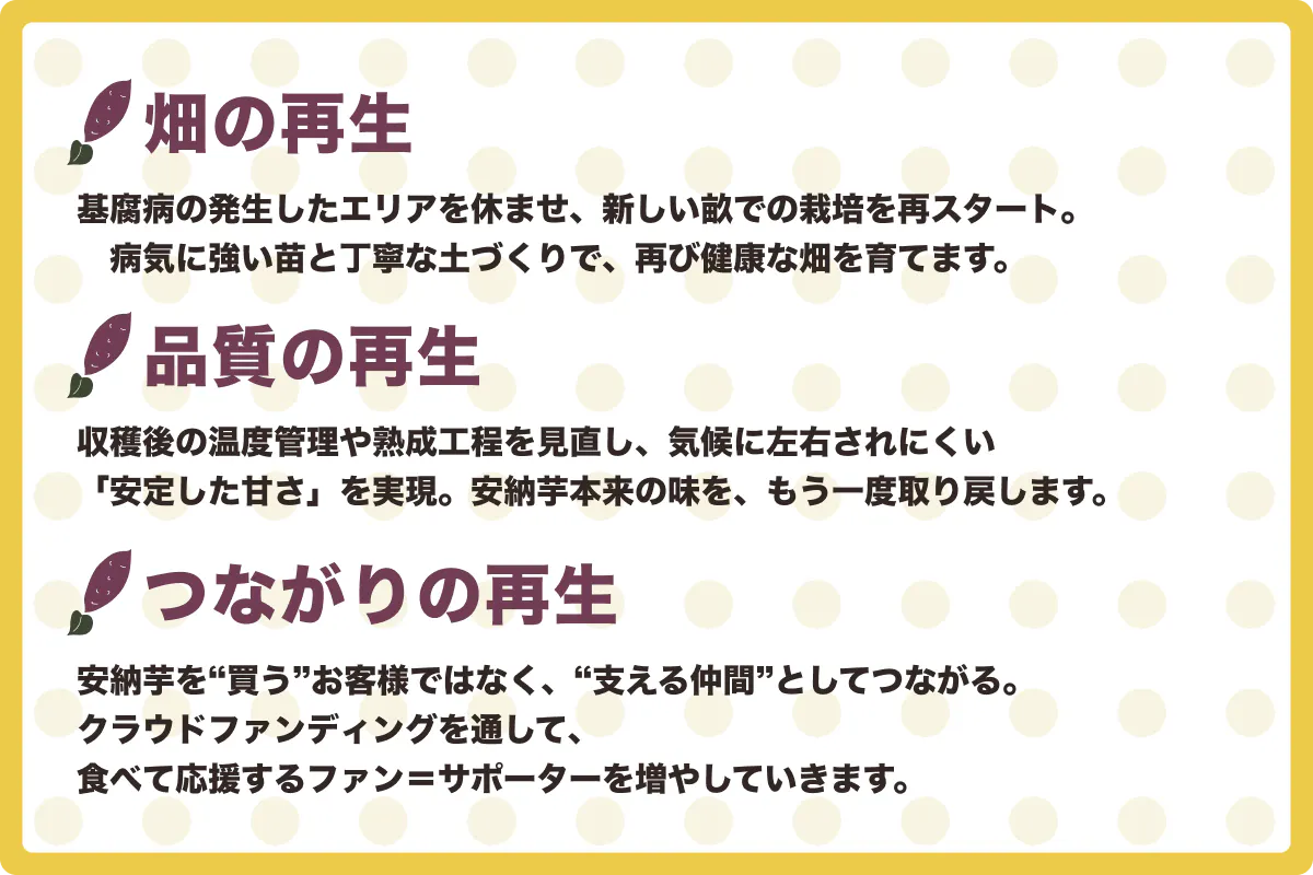 「安納芋の誇りを、もう一度この畑から。皆さんの力を借りて再出発します。食べていただくことで、この復活への大きな一歩を踏み出すことができます。