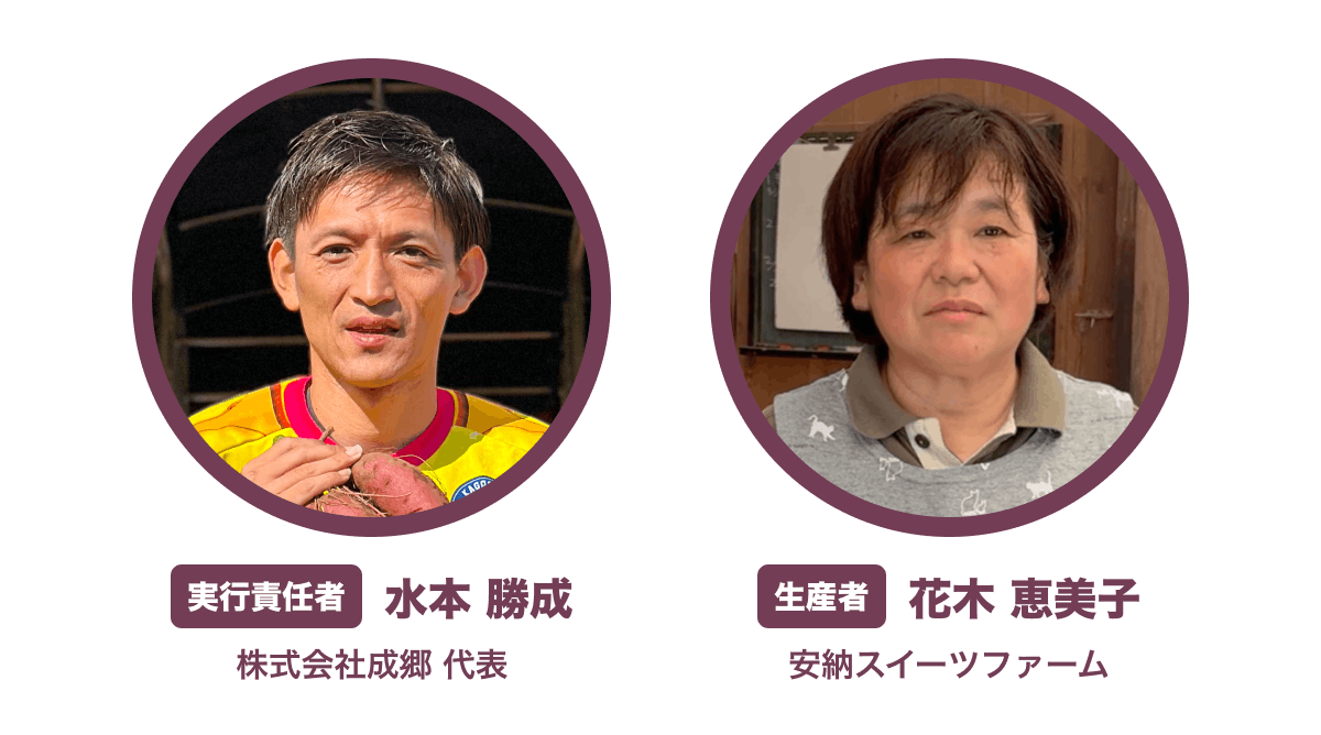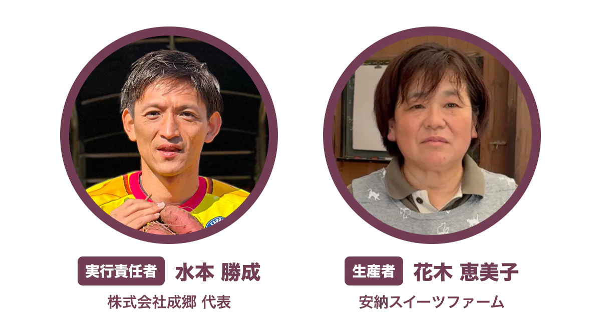 生産者の 花木恵美子(安納スイーツファーム代表) を助けるため、元Jリーガーで現在は農業を営む 水本勝成(株式会社成郷 代表) が中心となり、立ち上がりました。「もう一度、甘い安納芋をみんなの食卓へ。」