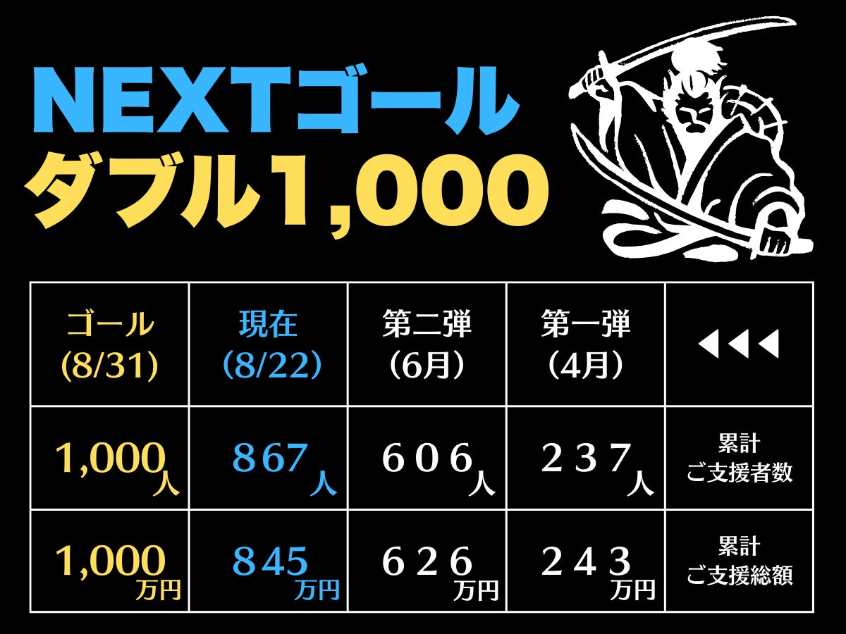 NEXTゴールW1000もあと8日となりました。昨日は3名の方から支援購入がありました。3個セットもありましたので約5万円のプラスとなりました。ありがとうございます。あと8日間で130人の方から、150万円ものご支援をいただくなんて、、、この無謀な計画に怯えながら、一歩一歩の積み重ねを感謝申し上げる次第でござりまする。ひとつのご家庭で2つも3つも必要がないものではありましょうが、、、お友達やご家族間で、向こう三軒両隣にて共同支援購入される方もいらっしゃいます。ぜひお仲間とお声がけくだされば嬉しい限りです。引き続きよろしくお願いいたします。