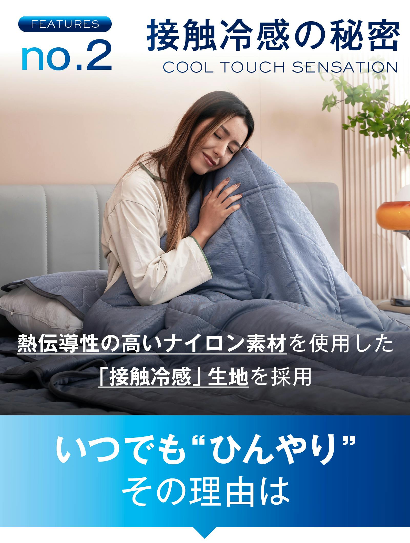 表面生地はQMX0.544のものにしました。従来の製品では触れた瞬間は涼しくても、涼しさが長続きできませんでした。そこで宇宙服にも使われる新素材を応用し、寝返りを打つ際に熱を放出し、ひんやり涼しさがずっと続く本製品の開発を致しました。