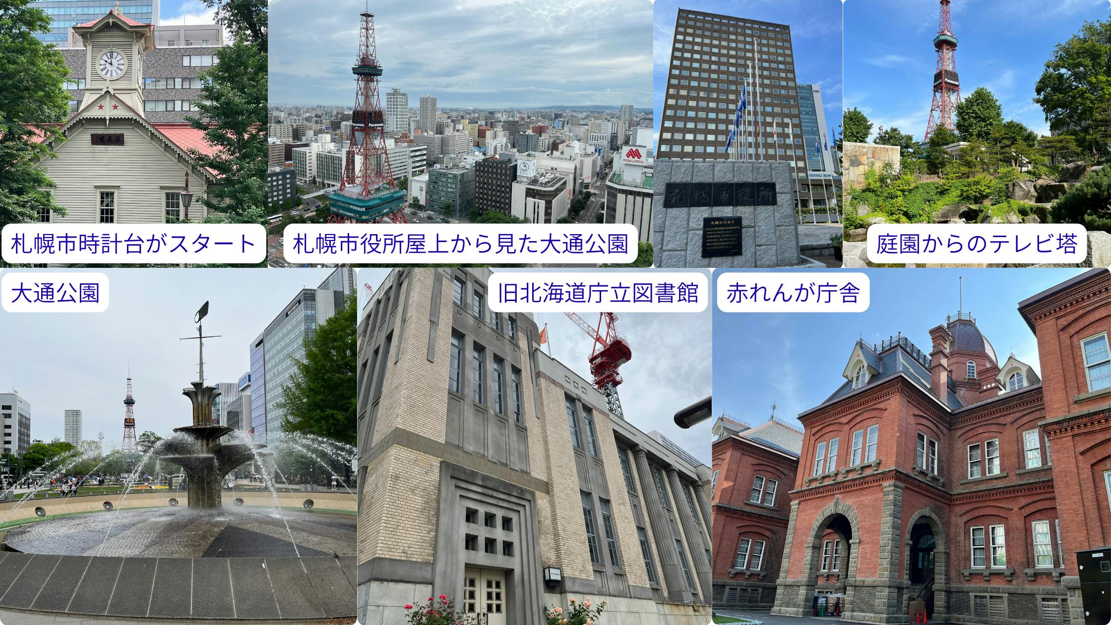 札幌市時計台→札幌市役所→大通公園→北1条通→北海道庁旧本庁舎(赤れんが庁舎)