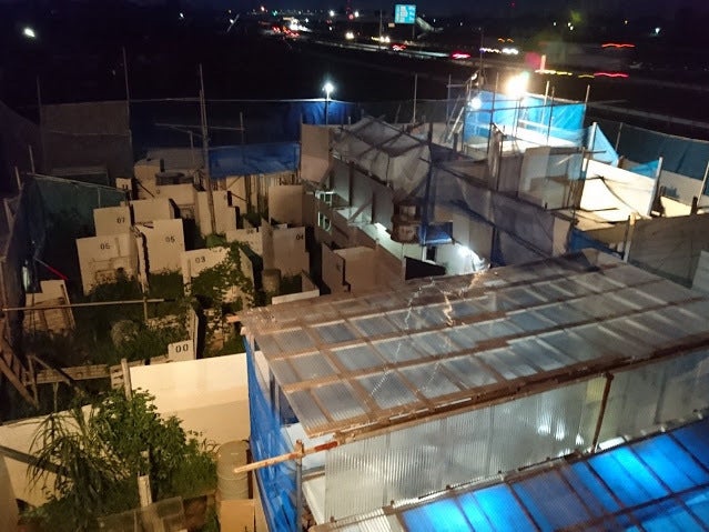 階段を作ったときの映像です。資材置き場から荷物を運ぶ為の階段から手造りしています。廃材として貰ったパレットをチェーンソーを使い半分に切断して、丁寧に重ねて金具で固定しました。