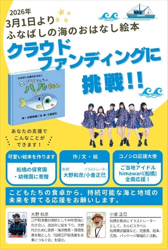 - 12,000円コース:【ライブチケット】船橋応援アイドル『himawari(船橋)』船上特別ライブのリハーサル参加&岸壁最前列 観覧チケット(先着10名様・4月4日正午~リハとライブ終了まで有効)。作者とhimawari(船橋)メンバー全員の直筆サイン入り絵本(24ページ)1冊(後日発送)。