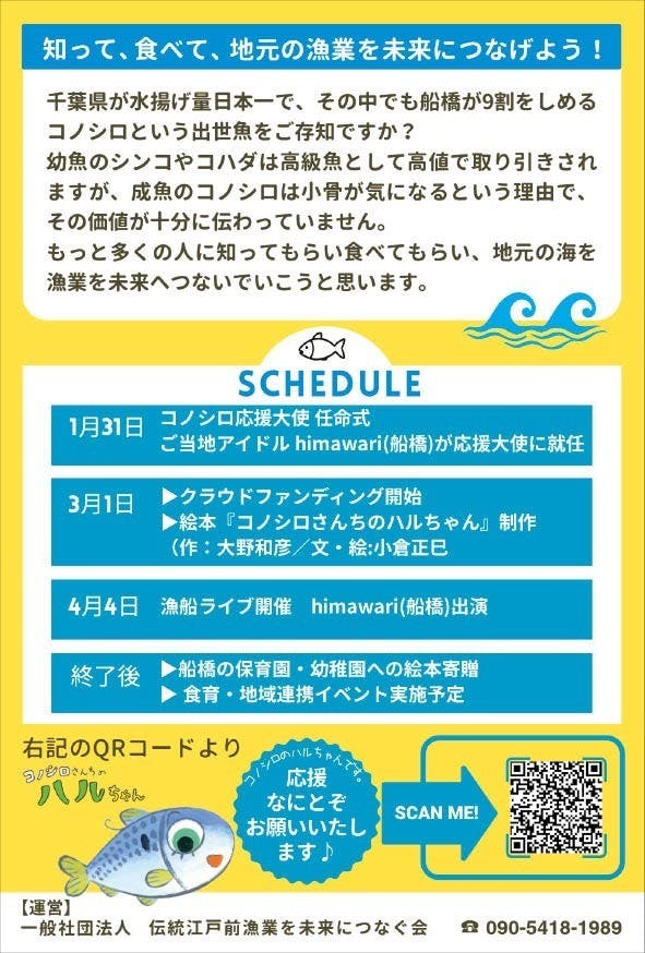 船橋市が全国一の水揚げ量を誇るコノシロを、より多くの人々に知っていただき、鮮魚売り場で親しまれる大衆魚として、消費者に選ばれる存在にしたいと考えています。調理次第で驚くほど美味しくなるコノシロの魅力を広めると同時に、海洋環境の保護、再生の重要性や、自然の中で力強く生きる生命の尊さを、絵本を通じてわかりやすく伝えたいと思います。次世代を担う子どもたちに私たちの思いを届け、これが彼らの心に深く響くメッセージとして刻まれてゆくことを願っています。
