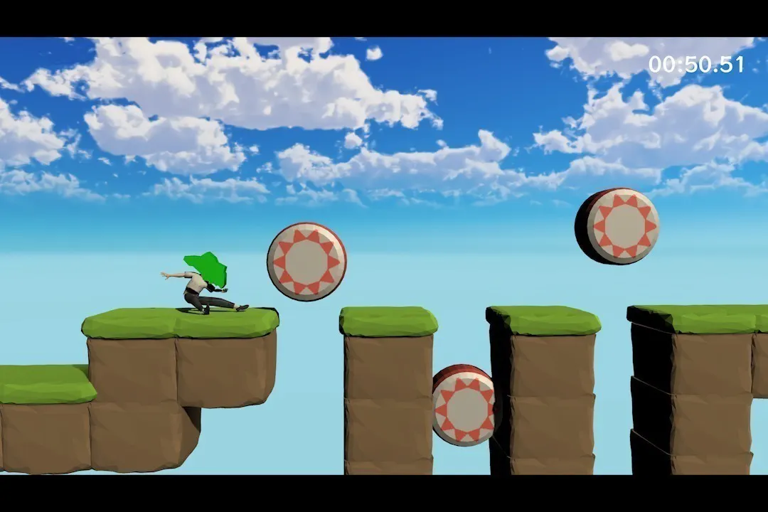 ステージから落ちないように飛んだり跳ねたりしてゴールを目指す、