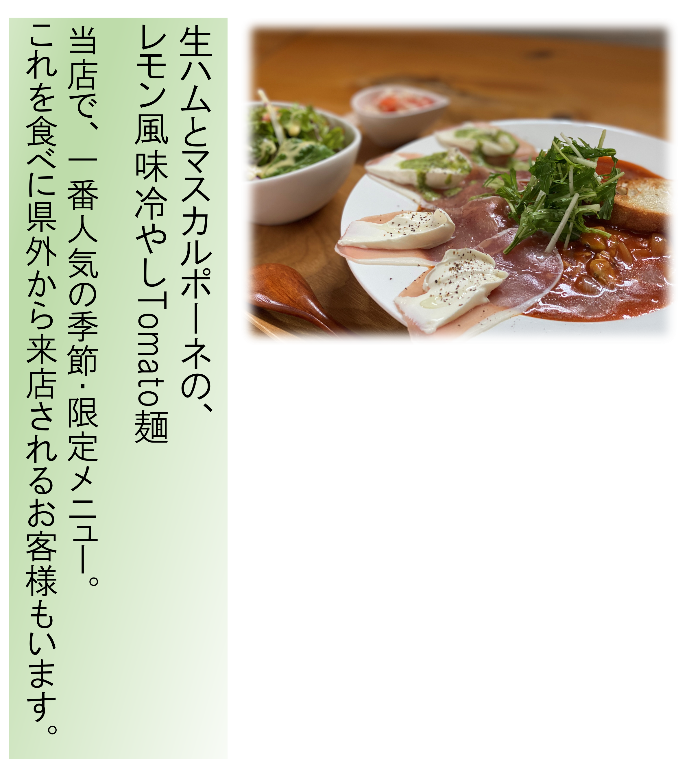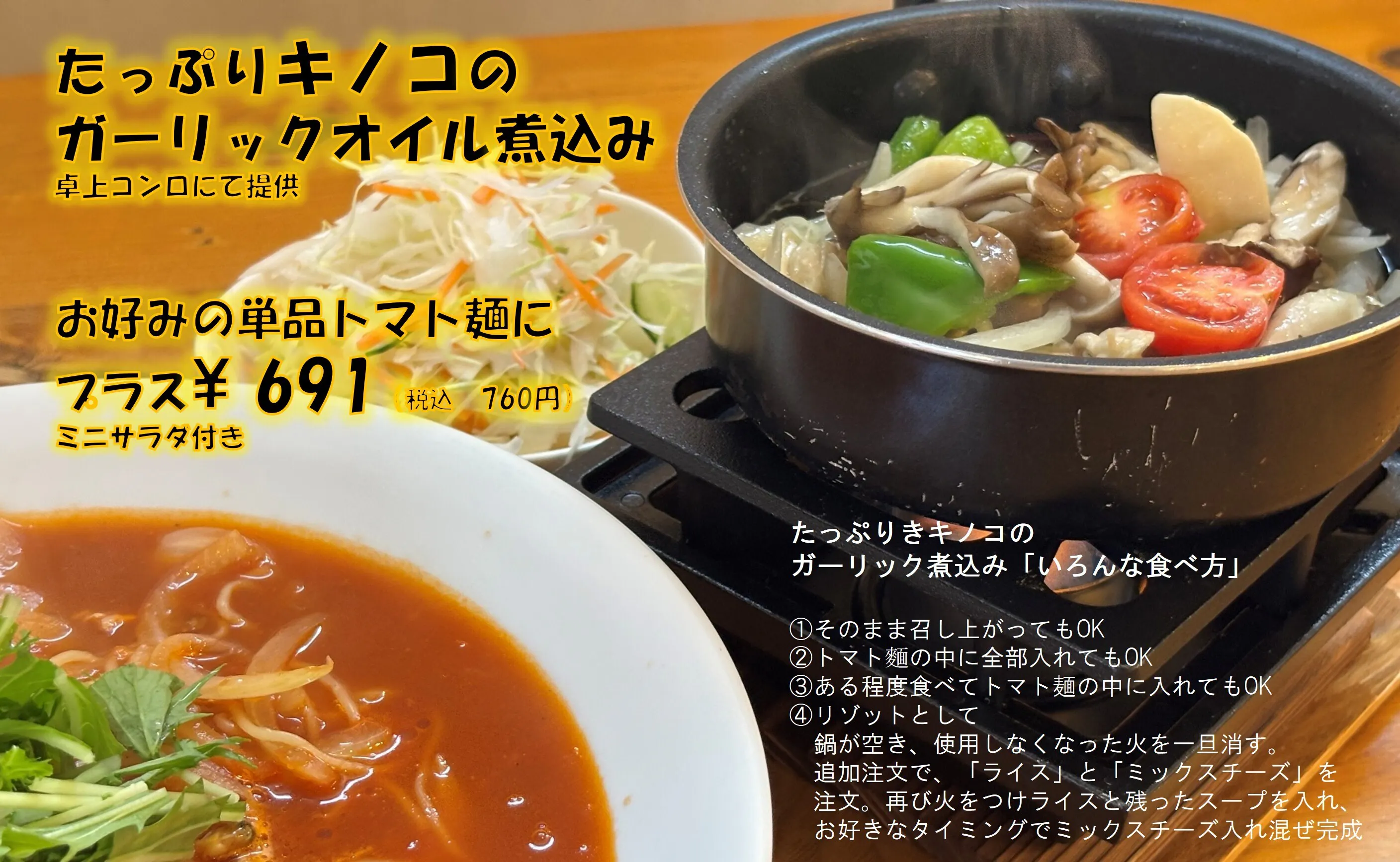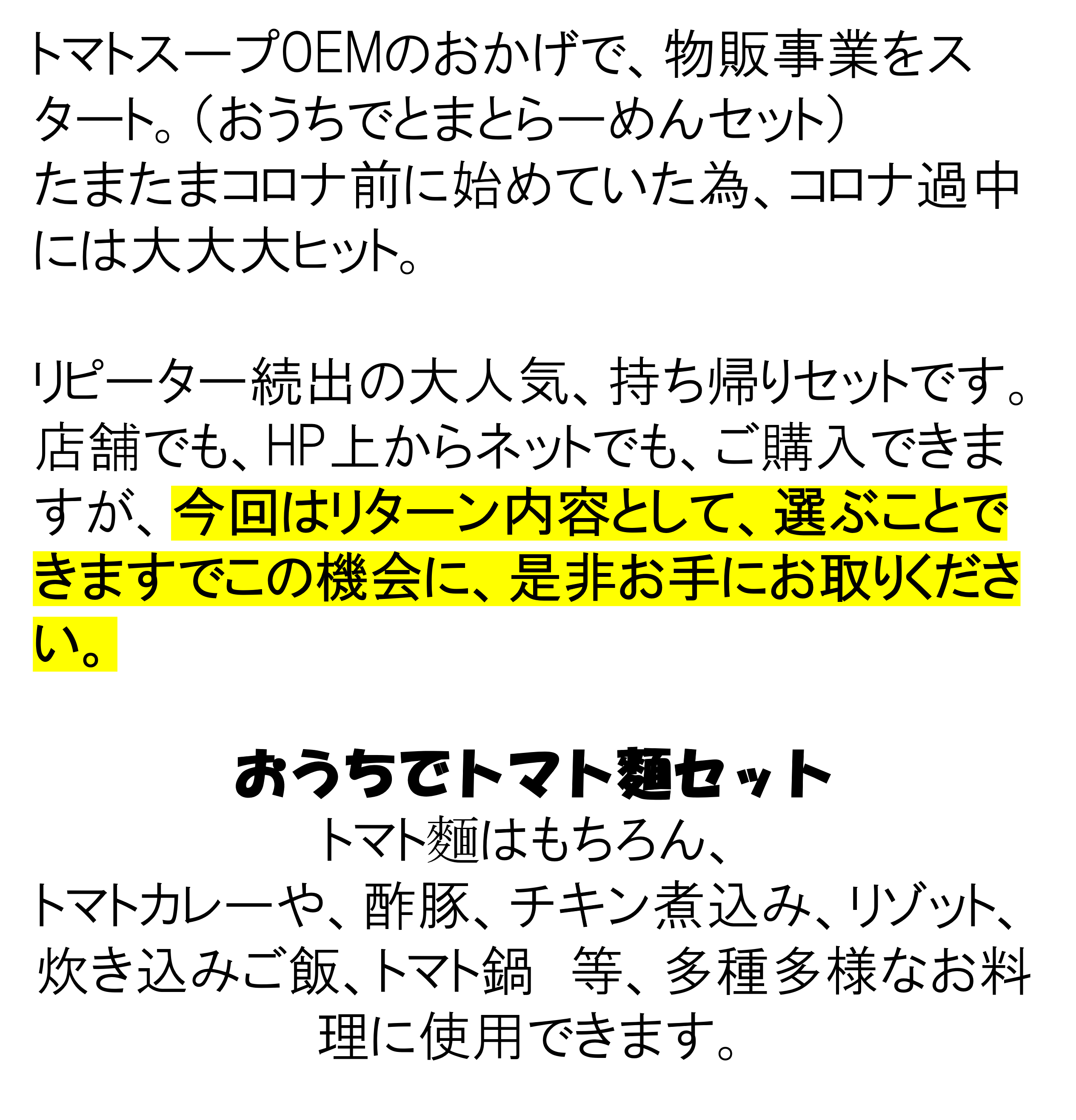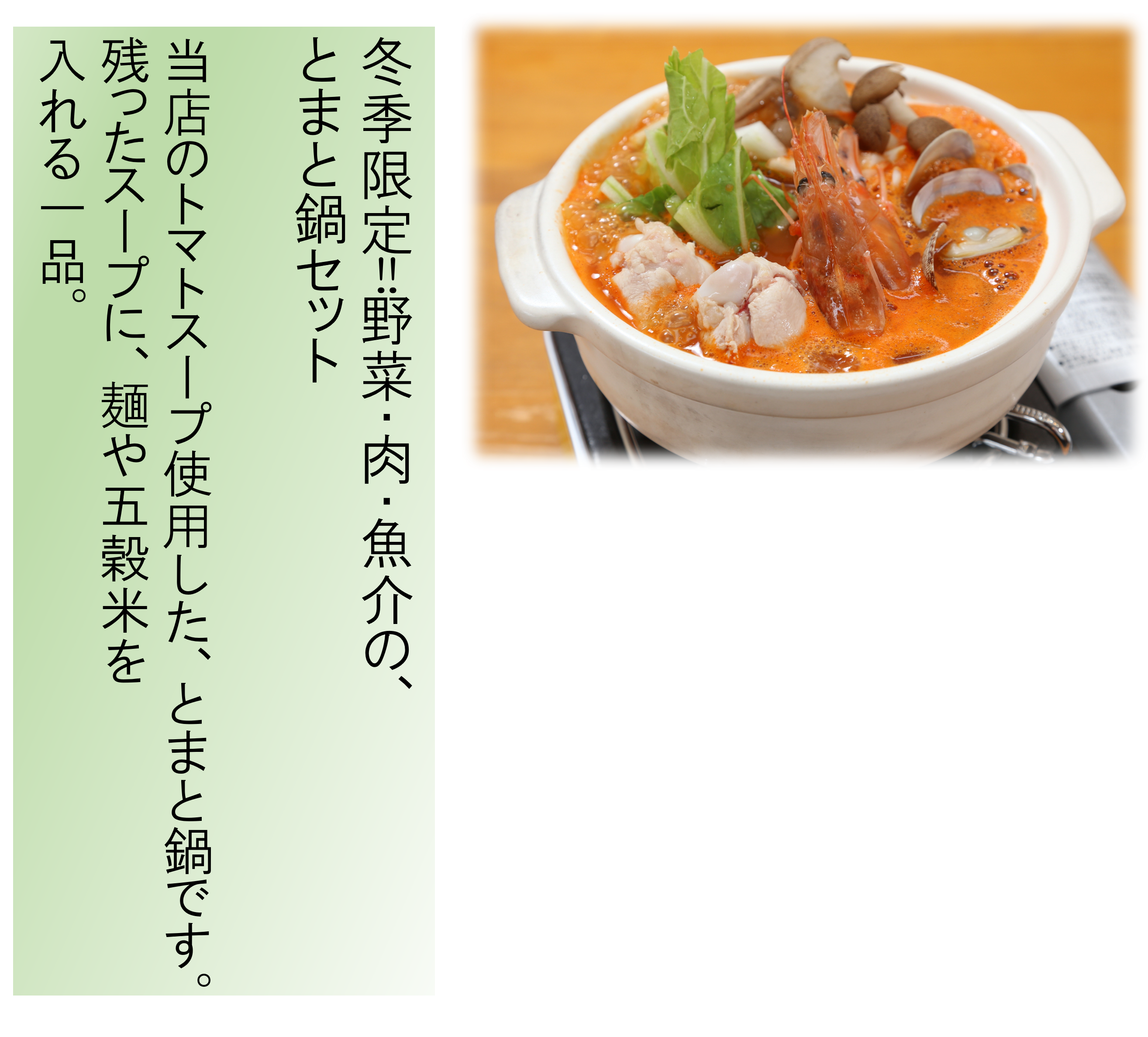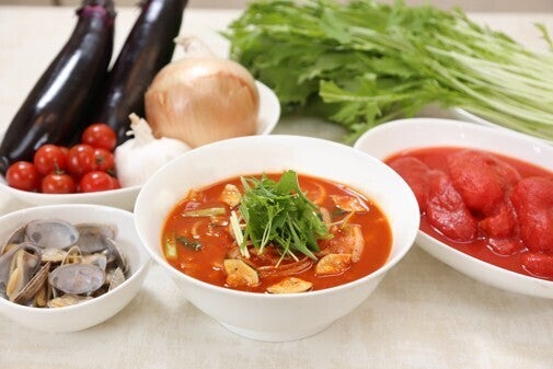 このように汎用性が良いトマト(トマトスープ)のため多様多様な用途お料理に使用できます。グランドメニューはホームページからご覧ください。