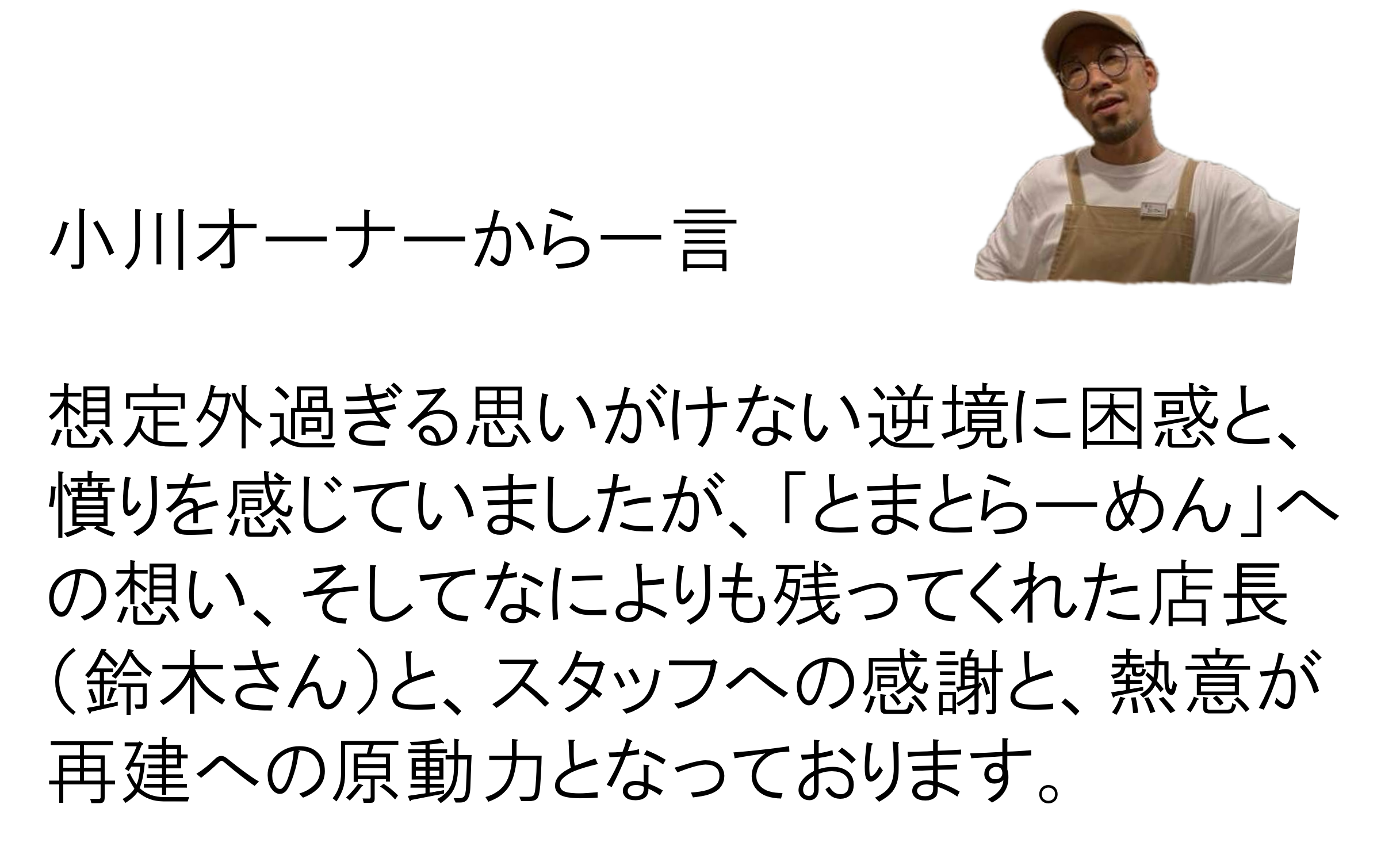 ただ、ほんとうにありがたいことに一番大事で大切な、新店舗で働く予定だった店長(正社員)、スタッフ3人(アルバイト)が、「必ず乗り越えて、とまとらーめん専門店で働きたい‼待っているので、必ず再建して、オープンさせましょう‼」と、泣きじゃくりながら「残ります!」と伝えてくれました。
