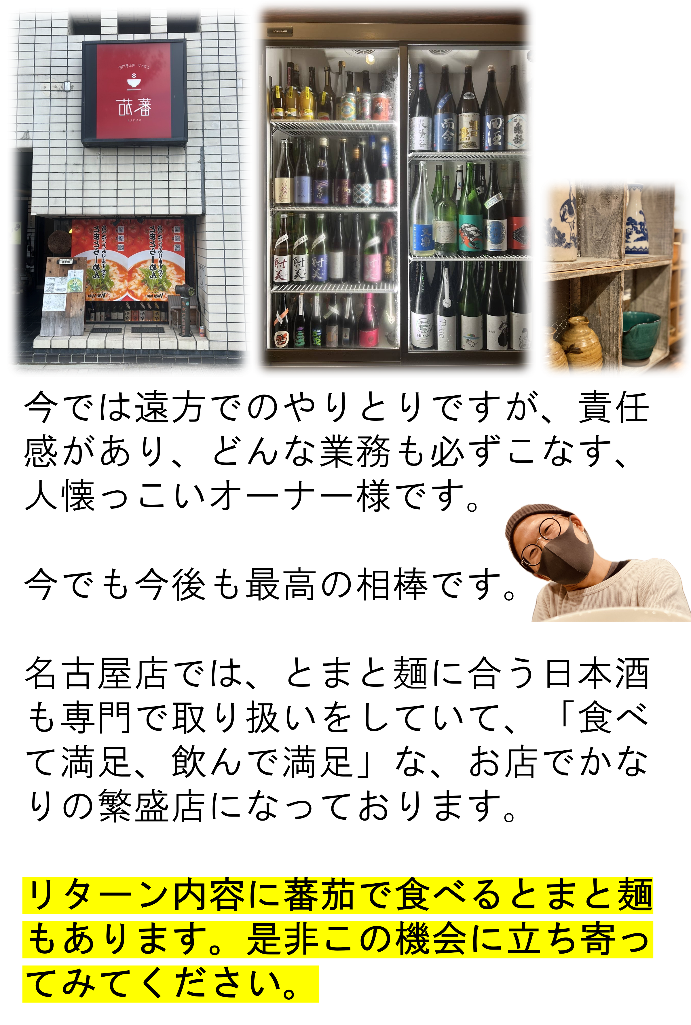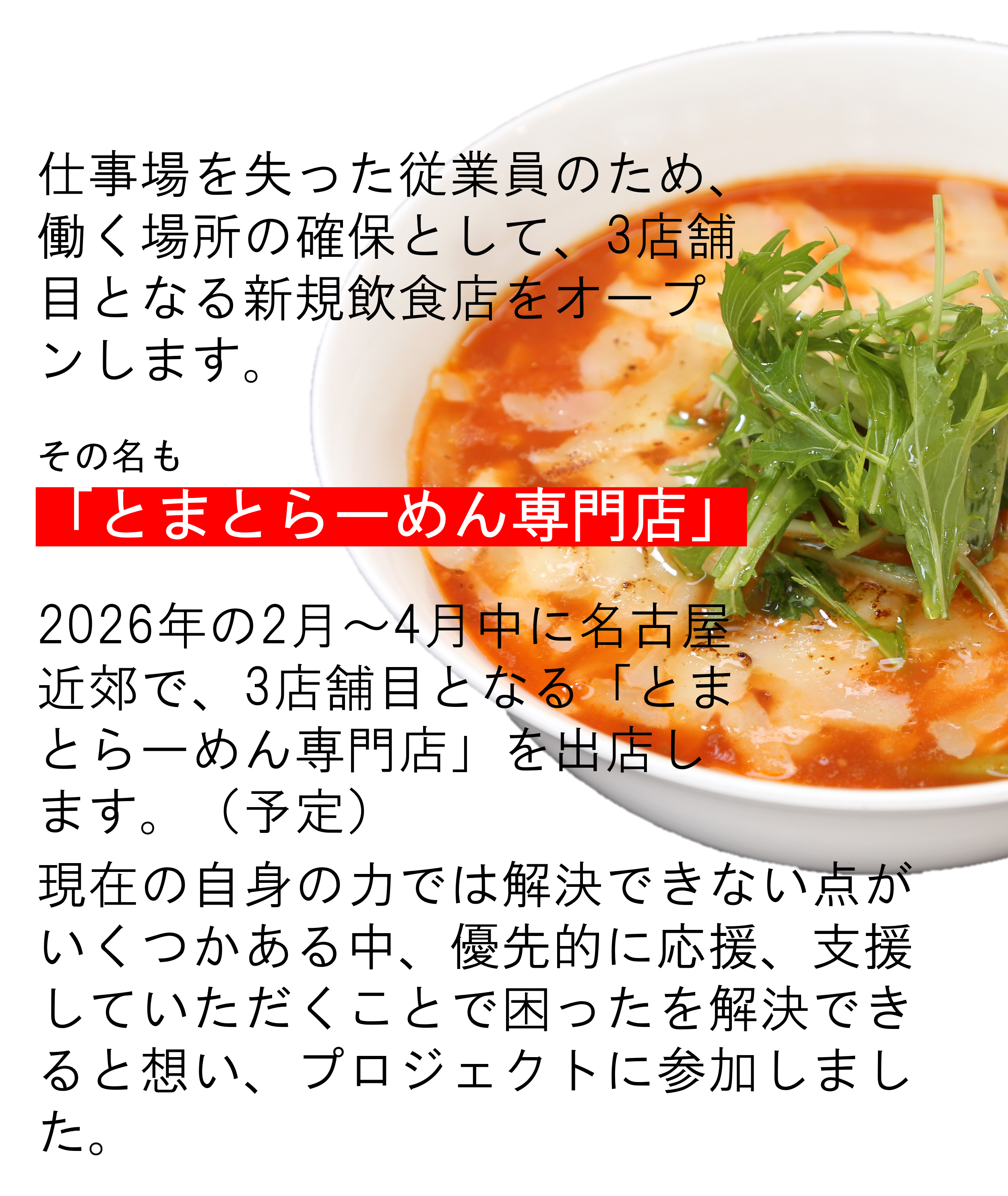 2025年7月1日に名古屋市新栄で「とまとらーめん専門店とクラフトビールのお店」をオープンする予定でした。すでに様々な準備が大詰めにさしかかろうとした1か月前に、トラブルにより、全準備が止まり、結局全てが白紙の状態に戻りました。(トラブル内容につきまして弁護士の下、関係者と守秘義務契約を締結しているため多くは伝えることができません、申し訳ございません)
