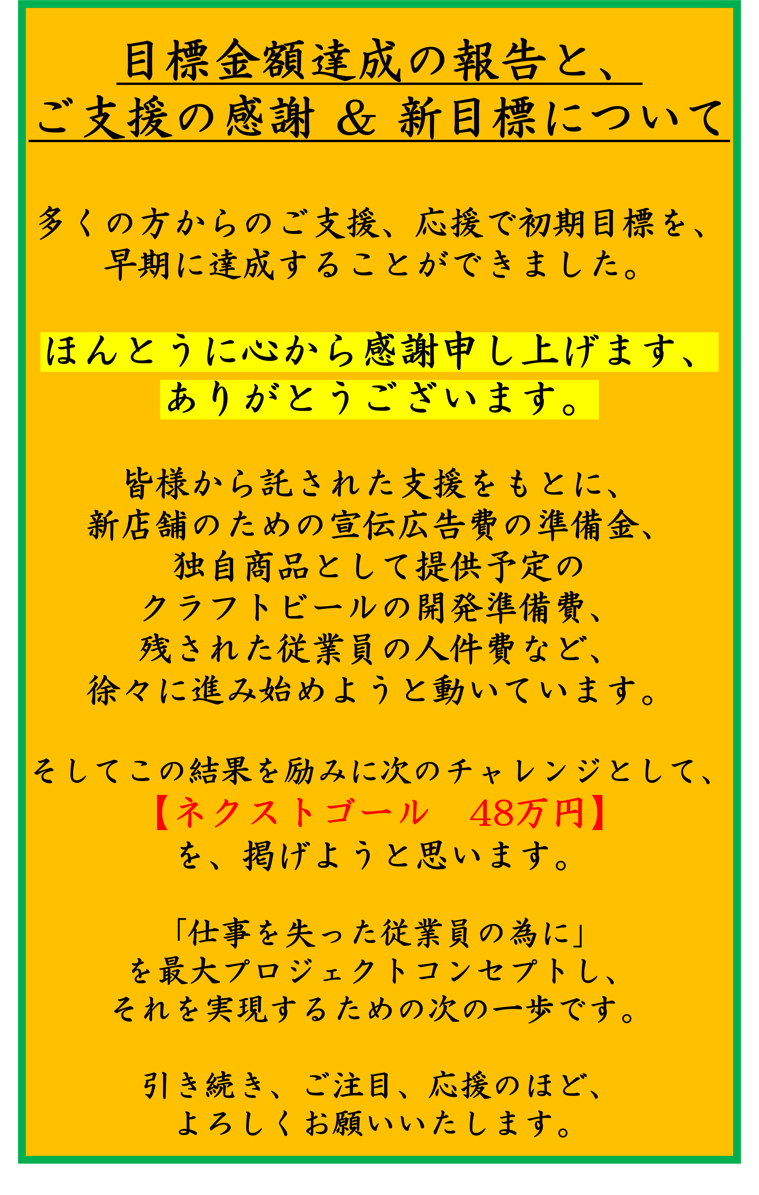 そして大変申し上げにくいことではありますが、損失額が大きく、自己資金、融資を加味しても現在、経済的に自身の力では乗り越えられる現状ではなく、皆様にお力添えをしていただきたく、プロジェクトに至っています。