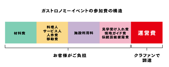 参加費用には、食材費のほか、料理人や場所を提供してくれる施設、見学を受け入れる生産者、伝統芸能を披露してくれる団体やガイドへの支払いが含まれます。その為、参加費は、お一人あたり数万円~十数万円となります。ここに私たち実行委員会の「運営費(事前視察・調整、企画、運営、当日のアテンド費用など)」を加えたいところですが、それではさらに費用が高額になります。費用がネックになり、本イベントの趣旨に共感し、参加を希望される方々のハードルにならないようにするためです。