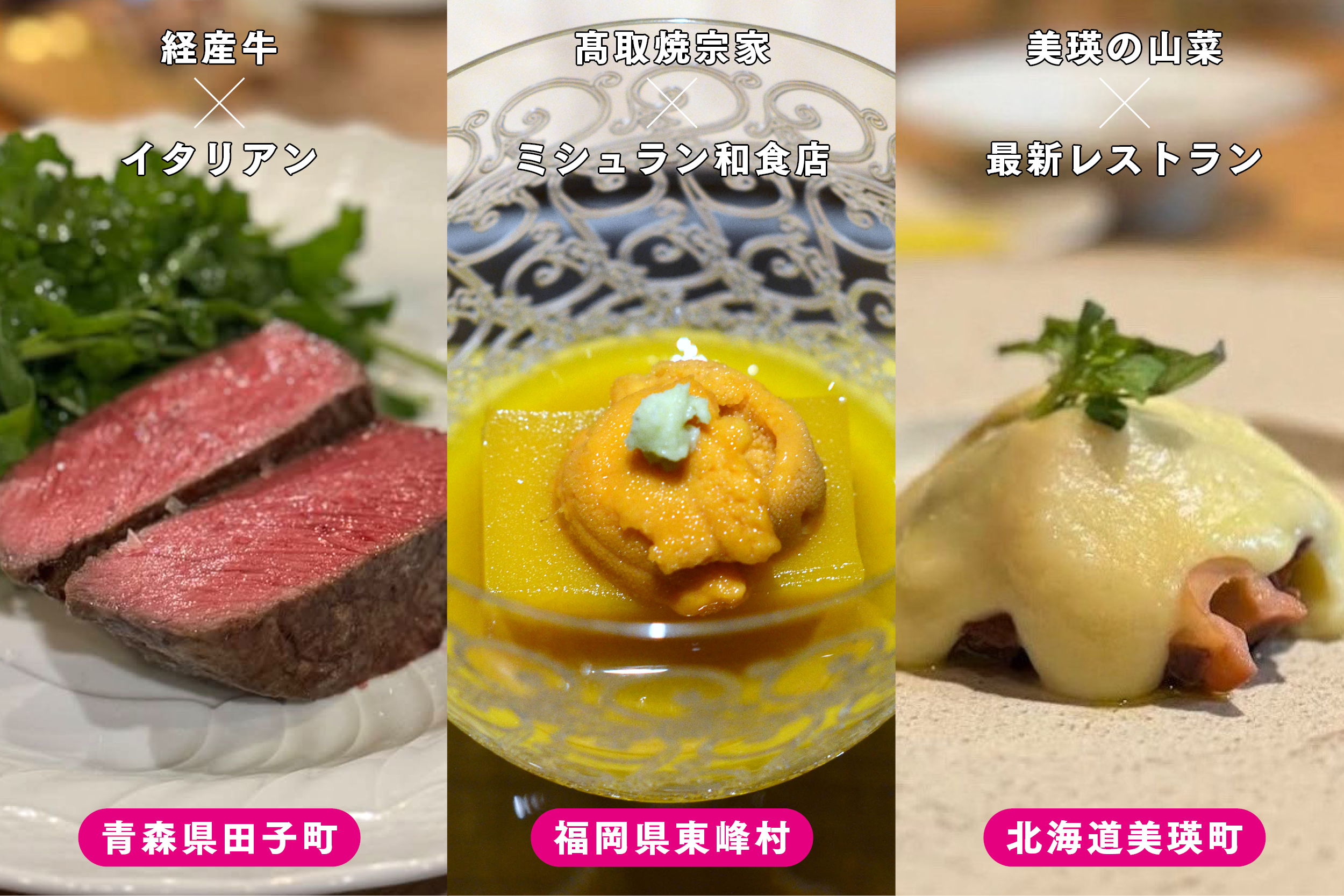 連合に加盟する3つの町村にまつわるガストロノミーダイニングを企画します。ガストロノミーダイニングは、地元の生産者や陶芸作家といった方々と触れ合いながら、その地域の文化や歴史、産業を知ることができる「特別体験」と、地域の食材を使った「特別料理」を味わえる、旅と食のイベントです。