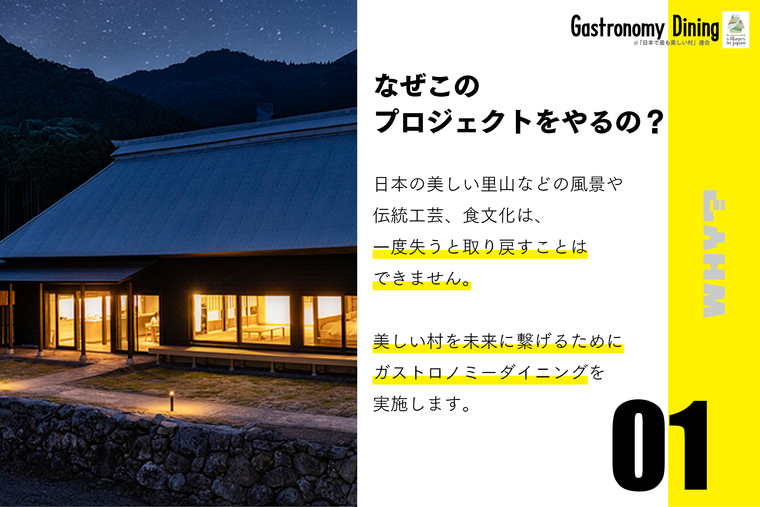 「日本で最も美しい村」連合(以下、連合と記載)加盟の57町村地域(2025年8月現在)で、【日本で最も美しい村のガストロノミーダイニング】を開催したいと考えています。