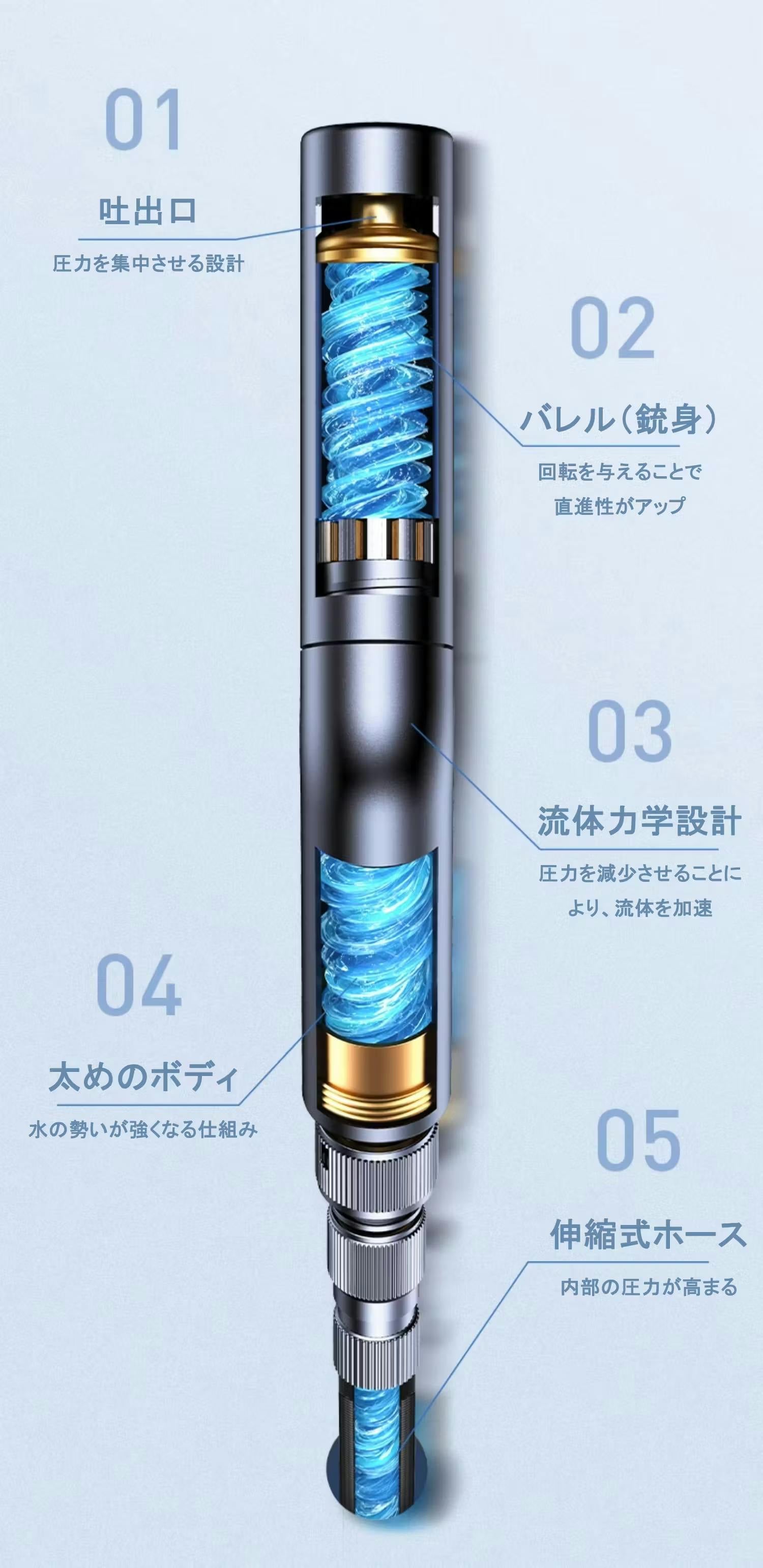 ホースの高い伸縮性により、自然な動力が生まれ、ノズル内のタービンが水流を加速します。水が渦を巻くことで水圧も向上します。
