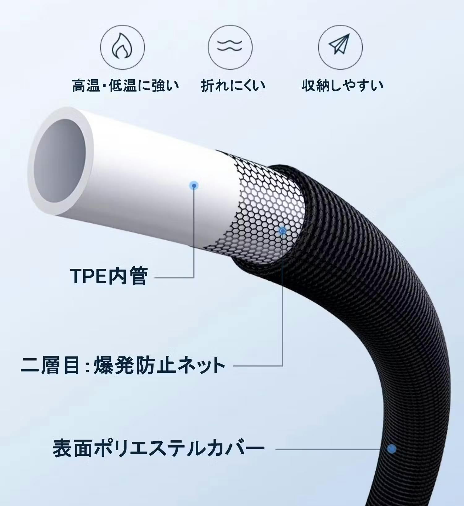 2層構造ホースで高水圧に耐えるために設計されています。内側のTPE素材は耐久性が高く、伸縮性があり、外側には高強度のポリエステルが使用されています。これにより、ホース全体が頑丈で水漏れの心配がありません。