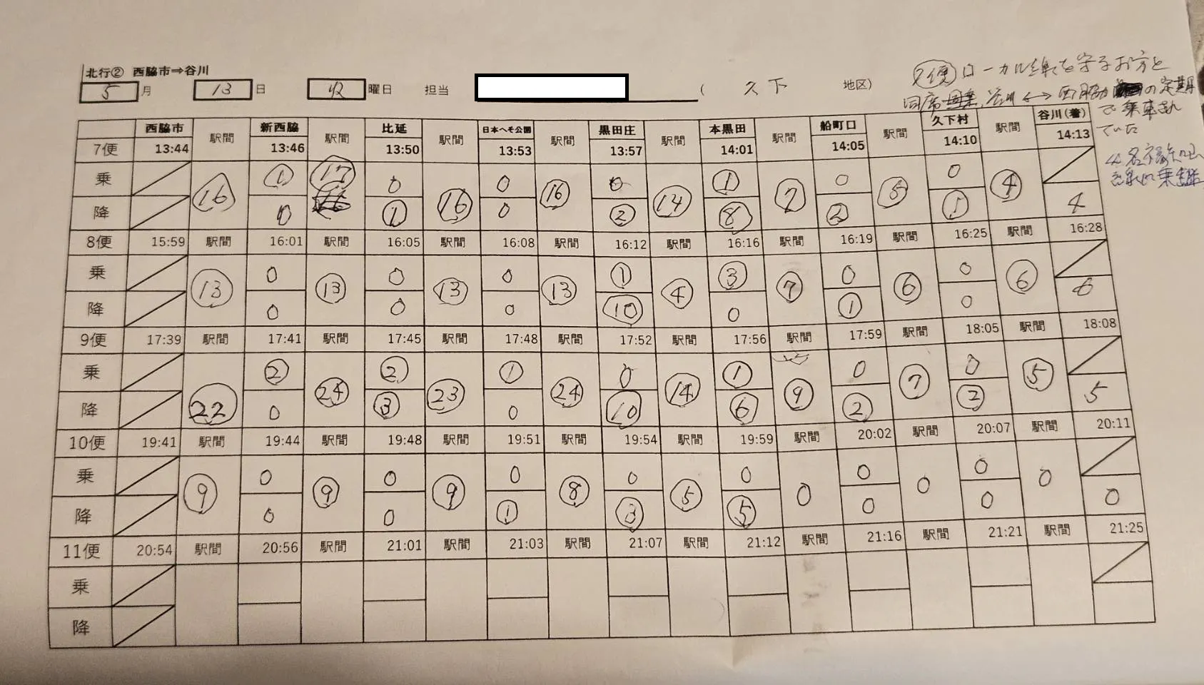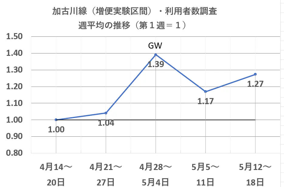 実験開始当初の調査は、増便開始の4月13日から開始され、GWを含めて5月18日まで毎日実施されました。始発から午後8時台の便までの全便に調査員か乗車して駅ごとの乗降客数を数えることによって、利用者数を求められています。(早朝の2往復は、高校生が通学で利用している区間が対象。それ以外の便は、全区間が対象。)