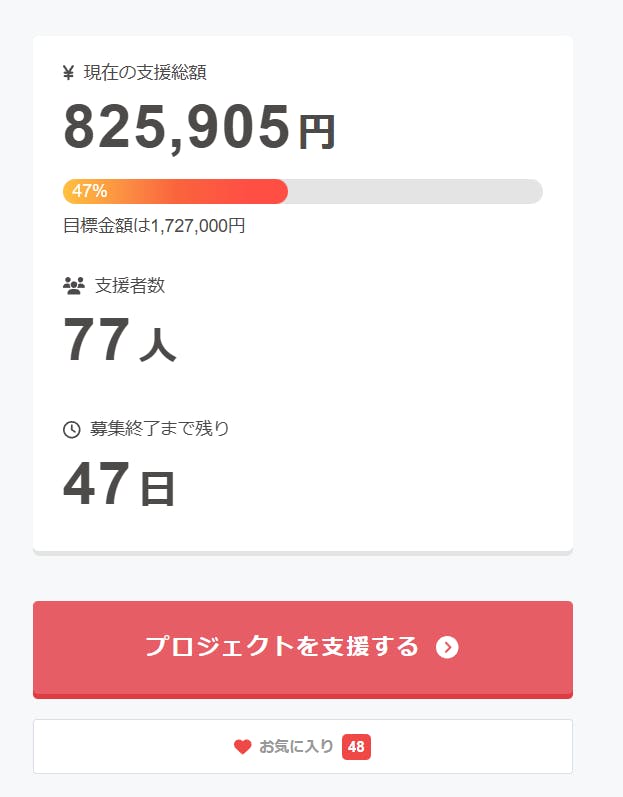 なんと支援者が77名を超え、おかげさまで80万円を超えました。