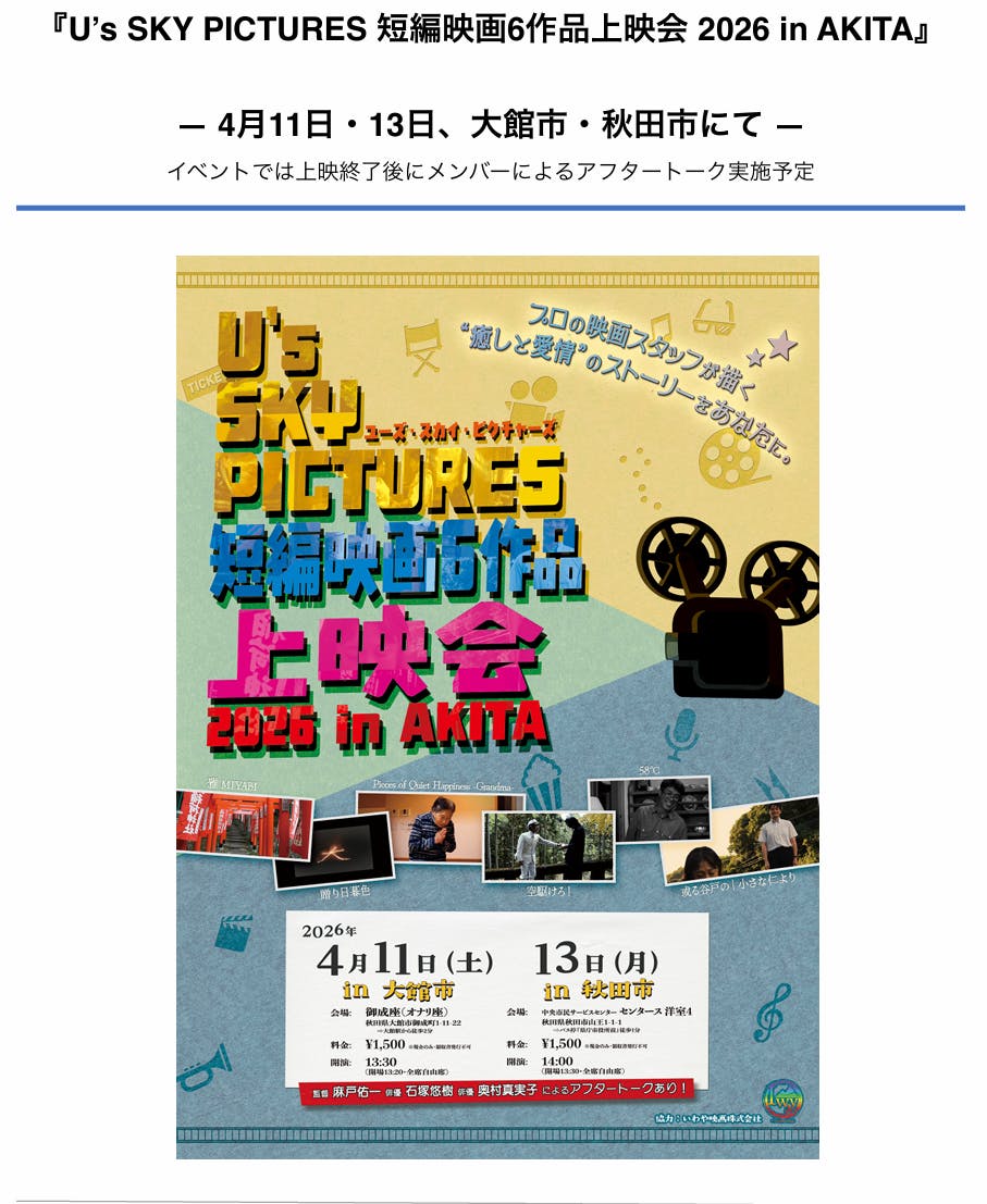 4月11日(土)と4月13日(月)に秋田市出身の映画監督が秋田市と大館市で短編映画の上映会を行います。