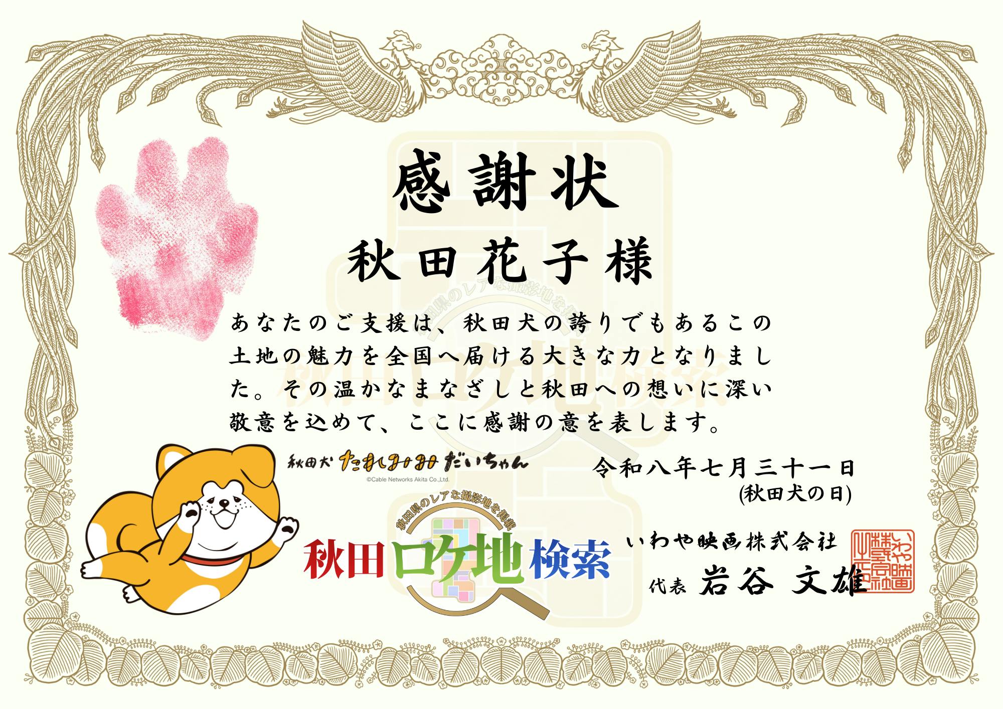⑥【秋田ロケ地検索×秋田犬たれみみだいちゃんコラボ感謝状】