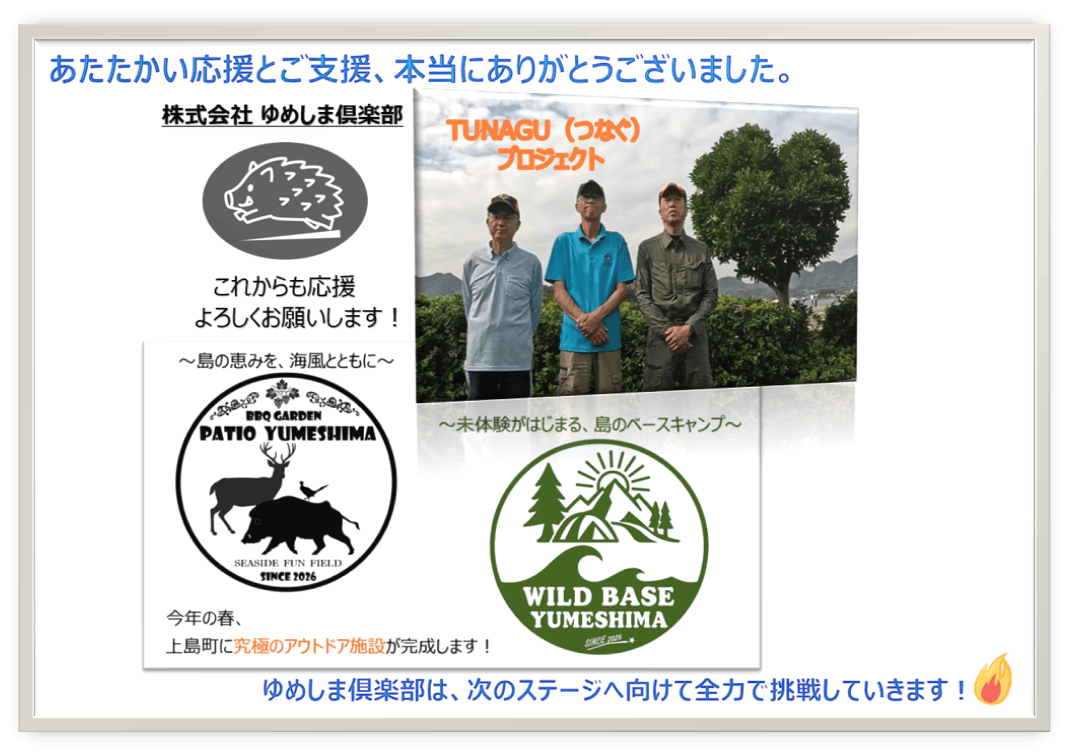 2025/11/16 17:48皆さま、あたたかい応援とご支援、本当にありがとうございました。 「ジビエBBQガーデン&オートキャンプ場」開拓プロジェクトは昨日、無事にクラウドファンディングの期間を終えました。目標額には届きませんでしたが、それ以上に、皆さまからいただいた応援の言葉、シェア、そして見守ってくださる気持ちが、ゆめしま倶楽部一同の大きな力となりました。今回の挑戦を通じて強く感じたことがあります。それは──「上島町を元気に笑顔でつなぐ!という想いは、一人ではなく“みんなでつないでいくもの”だということです。」実は、私たちが歩き始めたこのプロジェクトは、まだまだ第一弾! 「ジビエBBQガーデン&オートキャンプ場」の開業は“夢の第一章”なのです。 ここから、RVパーク、マリンアクティビティ、無人島体験など、次のステージへ向けて挑戦は続いていきます。私たちはこれからも、情熱を絶やさず、上島町を笑顔で満たすために全力疾走で前へ進み続けます!そして何より──支えてくださった皆さまと一緒に、この夢を形にしていきたい。ゆめしま倶楽部は、上島町の未来を、皆さまとともに創ってまいります。あらためて心より感謝申し上げます。 今後の進捗、施設開拓の様子、活動の歩みも随時お届けいたしますので、引き続きあたたかく見守っていただけると嬉しいです。本当にありがとうございました。ゆめしま倶楽部 一同 もっと見る