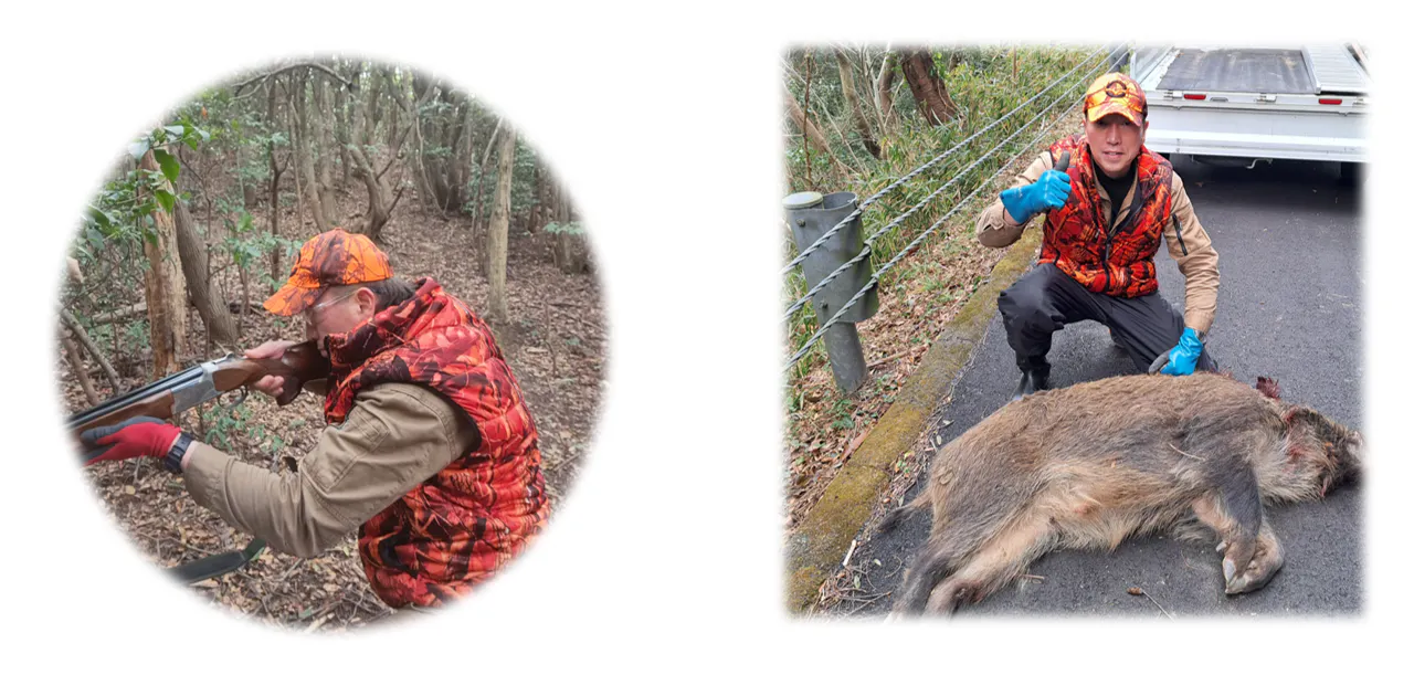 ここ離島の上島町でも、イノシシによる農作物被害や車との接触事故など生活被害が深刻化しています。場合によっては人身被害へつながる恐れもあります。 だから私たちは、こうした野生鳥獣による地域被害を減らしていく任務を行っているのです。