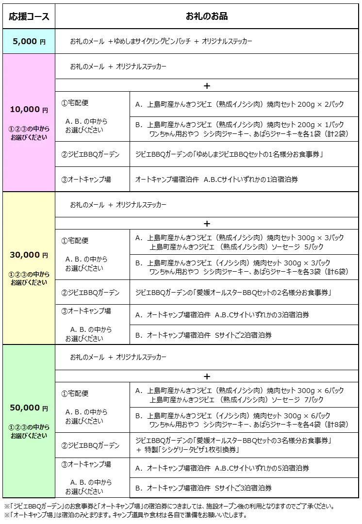 ※「ジビエBBQガーデン」のお食事券と「オートキャンプ場」の宿泊券につきましては、施設オープン後の利用となりますのでご了承ください。(有効期限は発行日から1年となります)