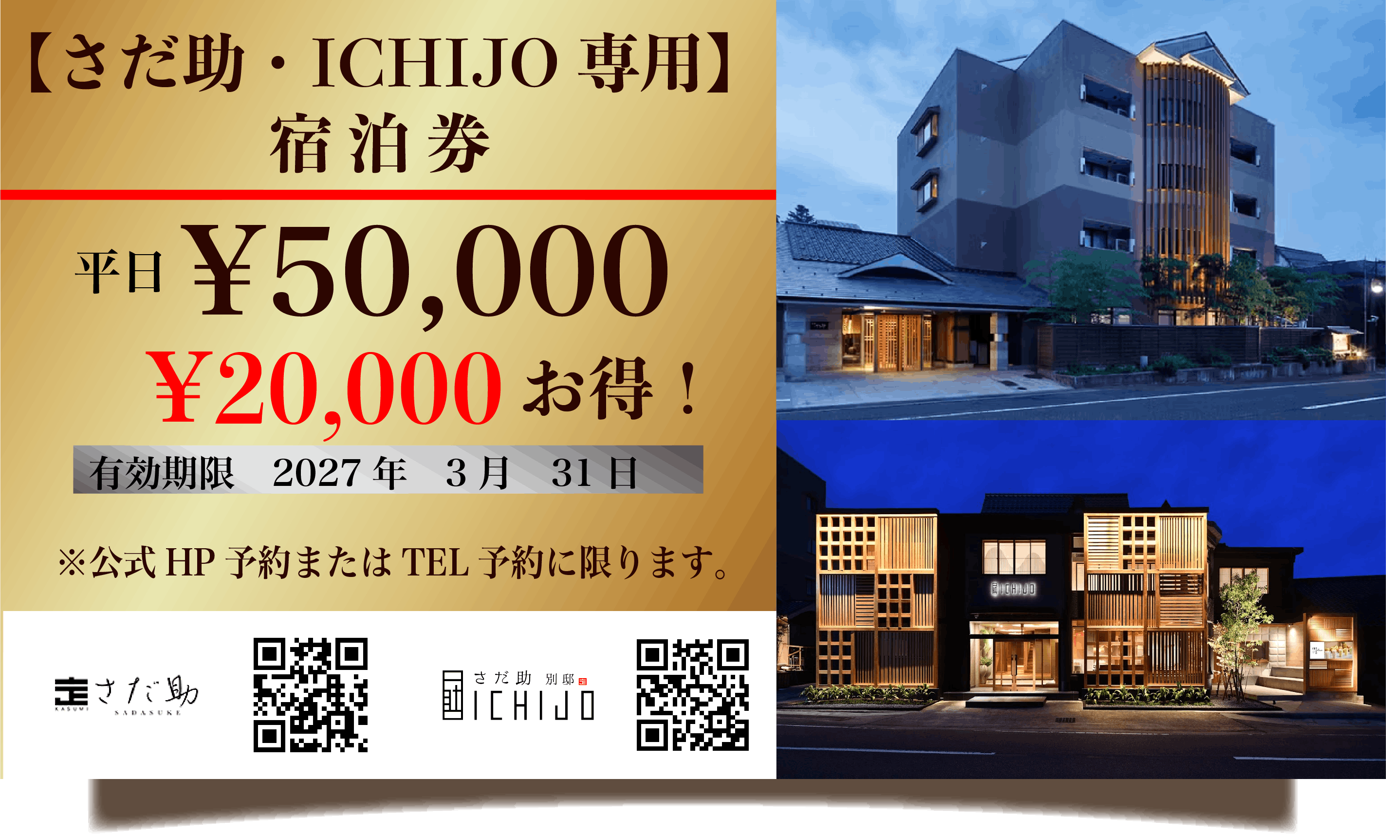 そこで今回、系列店である「さだ助」や「さだ助別邸 ICHIJO」でご利用いただける ご宿泊優待券 を新しくご用意いたしました。