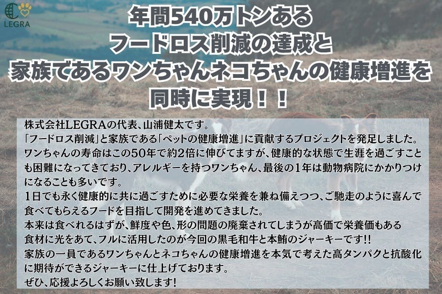 フードロスの削減×日本産ブランド食材=プレミアムペットフードで循環型のロンジェビティライフを創っていきます。