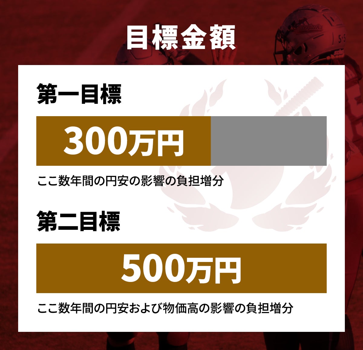 2025/12/27 12:27本日、皆様からお寄せいただいた支援金および寄付金につきまして、諸費用を差し引いた全額を、海外遠征費用の一部として支払いを完了いたしました。多くの方々より温かいお言葉とともにご支援を賜り、心より感謝申し上げます。本当にありがとうございました。リターンの品に関しましては、2026年3月の発送に向けて準備を進めております。今しばらくお待ちください。海外遠征につきましては、先日(12月13日)に保護者説明会を終え、現在、スポーツコース全員での遠征に向けて準備を進めております。実りある遠征となるよう、引き続き万全の体制で取り組んでまいります。また、本日、学校および周辺の大掃除を終え、年内の弊部の活動はすべて終了いたしました。今年一年、多くの皆様のご声援に支えられながら活動できたことに、改めて深く感謝申し上げます。来年も、より魅力ある部活動づくりを目指し、決意を新たにしたうえで、年末年始のオフ期間に入らせていただきます。来年も引き続き、追手門学院高等学校アメリカンフットボール部 LUMBERJACKS を温かく応援していただけますと幸いです。皆様におかれましても、どうぞご自愛いただき、良いお年をお迎えください。2025年12月27日追手門学院高等学校アメリカンフットボール部監督 朽原 優 もっと見る