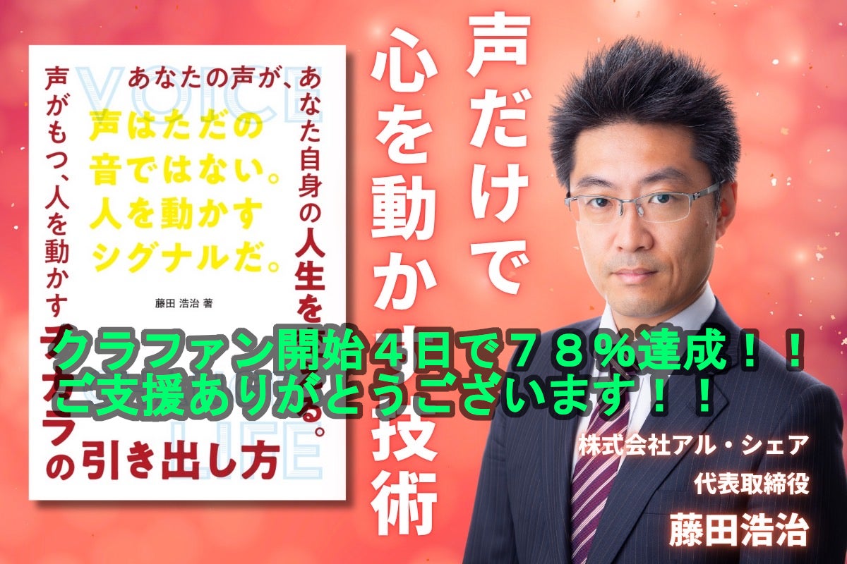 こんにちは、声優事務所 アル・シェア 代表の藤田 浩治です。初めてのクラファンに挑戦中で、開始から4日が経過しました。現在はというと、、、なんと78%達成!!!みなさまご支援いただき大変ありがとうございます!!初速がどのぐらいになるのか不安でしたが、あっという間に達成に近づいてきました。ひとえにみなさまのご支援の賜物とありがたく思っています。今回、書籍を発行するのは、個人的な思いというよりは、今後の声優業界についての心配事がたくさんあるため取り組みを実施しました。昨今の声優業界は、私が始めた30年前と比べると認知度も広がり、人気職業の1つにまでなっていきました。大変ありがたいことではありますが、需要と供給のバランスや、一過性の問題、賃金の低さなど、様々な観点で課題があります。また、最近ではAIの台頭もあり、単純な「音声」ということだけでは太刀打ちできない時代がもうまもなくやってきます。そしてAIと対抗しても仕方がないですので、対抗でもなく、共存でもなく、私達声優の表現は「異質なもの」であるという認識を広める必要があると感じています。AIや新たな技術と比較して、人間は劣る部分がたくさんあります。読みの正確性や長い文章での体力差、声の質の自由な変化などはAIには叶わなくなります。でも、ここだけは変わらないとはっきり言えることが1つあります。それは、「人間が人間にやってほしいこと」です。これだけは必ず残ります。どれだけAIが進化しても、人が落ち込んでいるときに励ましの声がほしいのは人間からです。正確さや正しいとかは関係なく、人間からほしい言葉なのです。その声を出せるかどうかは、人間にかかっています。だからこそ、私たち声優は「声」をただの「音」ではなく、「想いを伝える伝達手段」として活用しなければなりません。その「声」について、プロの声優だけが知って使えるのではなく、一般の人たちにも声の重要性を知ってほしいのです。声が世界を変えるとまで私は思っています。さまざまなエピソードがありますが、それはまたの機会にお話するとして、この取り組みが日本中に広がっていくと、声のことを教える人がたくさん必要になります。その時に、声優が日本の津々浦々で声の指導をするということが起きると考えています。私たちアル・シェアが目指す、声優業の進化系「ボイスコンサルタント」です。学校や自治体、企業など、さまざまなところで使われている声のバージョンアップに私たち声優が関わることができたなら、よい未来が作れると信じています。最終的には日本の幸福度ランキングにも影響すると考えています。日本を豊かにするのは「声」なのではないかとプロの視点からも感じていますので、今回の書籍はその最初の一手になるのではないかと考えています。クラファンはまだ始まったばかりですが、さらなる高みをめざして取り組んでまいりますので、今後の声優の未来につながる取り組みにぜひともご支援ください!!