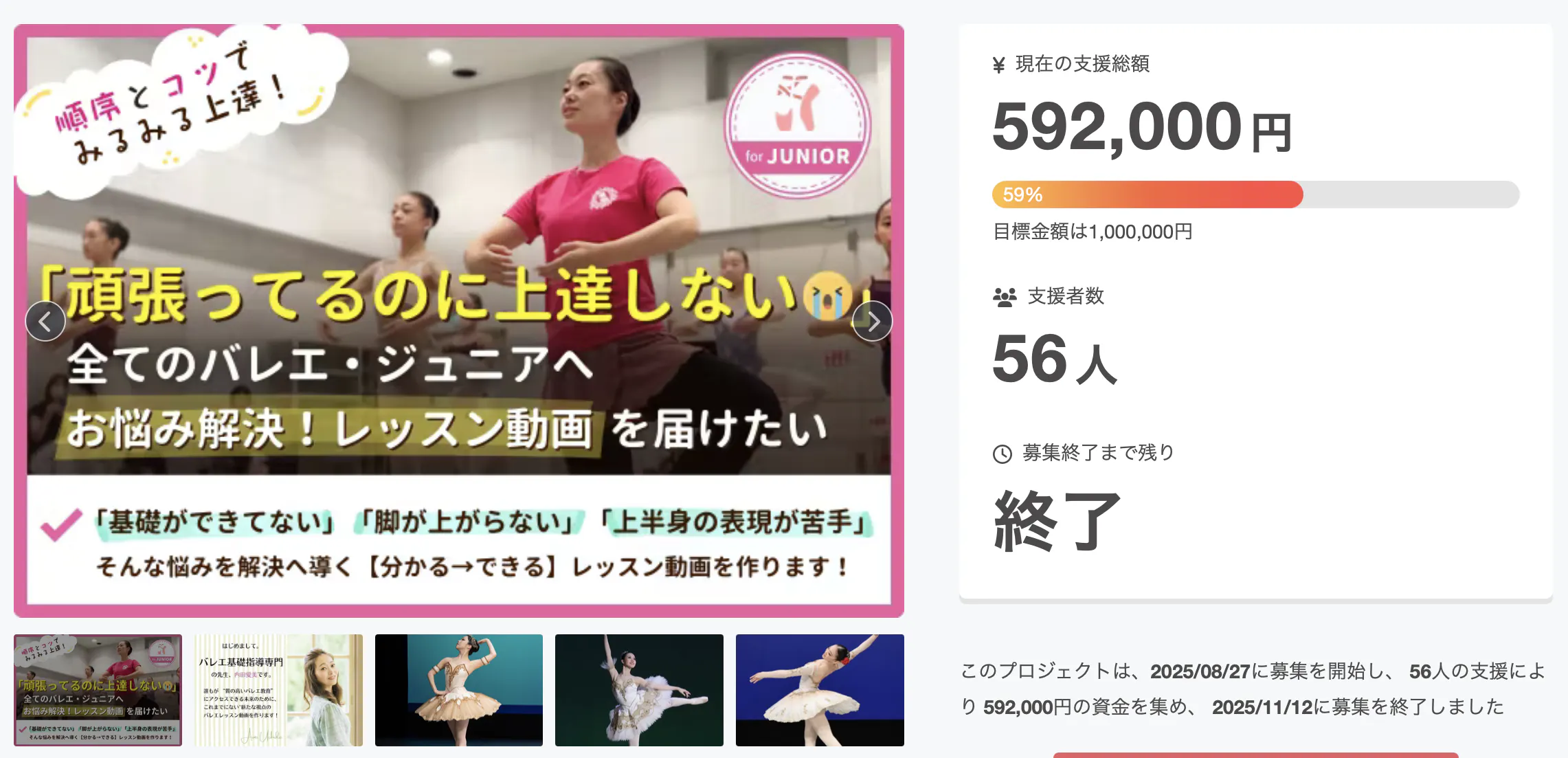 2025/12/17 20:20ご支援者の皆さまいつも温かな応援を本当にありがとうございます。内田愛美です。この度、皆さまのお力添えのおかげでレッスン動画の撮影が無事に終了いたしました。撮影当日は、ダンサー・ピアニスト・スタッフが一丸となり、「本当に必要な学びを、丁寧に、誠実に届ける」ことを大切にしながら、一つひとつのカットを積み重ねました。現在は、編集作業に入る準備段階に進んでおり、ここからさらに・見やすさ・分かりやすさ・繰り返し学びたくなる構成を意識しながら、時間をかけて仕上げていきます。完成・お届けは2026年4月頃を予定しております。少しお待たせしてしまいますが、「待ってよかった」と思っていただける内容になるよう、最後まで妥協せず取り組んでまいります。改めて、このプロジェクトを信じて支えてくださったこと、心より感謝申し上げます。引き続き、進捗は活動報告にてお伝えしていきますので、どうぞ楽しみにお待ちください。内田愛美 もっと見る