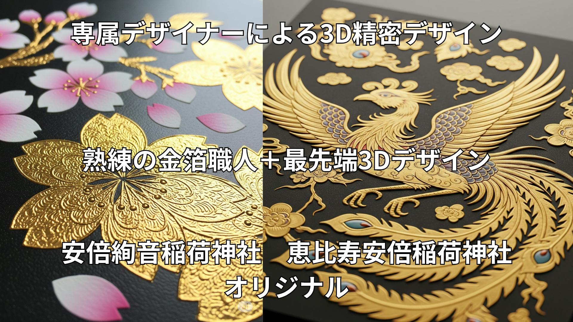 繊細な透明素材の上に、金箔を一枚一枚手仕事であしらった、稲荷神の神威と華やかさを象徴する逸品です。