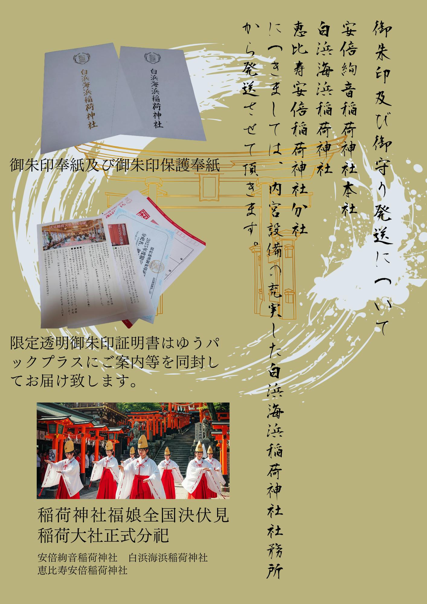 今回も限定透明御朱印と言う事で、偽造防止ロッドナンバーとコピーガード付限定証明書が一枚に付一枚付帯します。白浜海岸稲荷神社社務所からの発送、白浜海岸稲荷神社内宮祈祷になりますので、白浜包装でお届け致します。