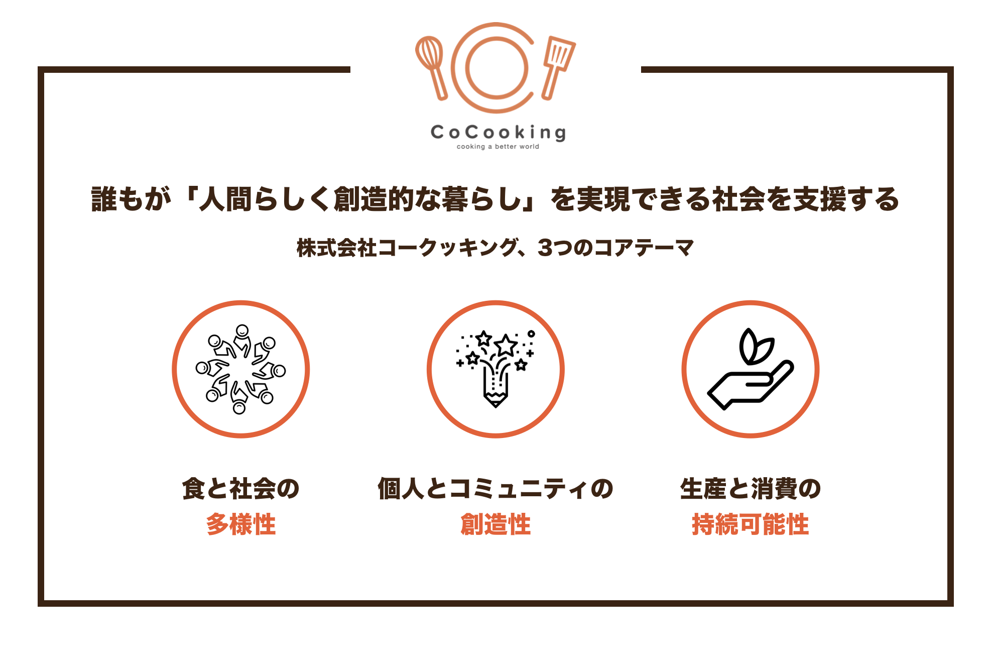 こうしたことから私たちは、食に無限の可能性を感じています。私たちコークッキングは、食や料理を通じて社会の「創造性」と「多様性」を促進する会社です。