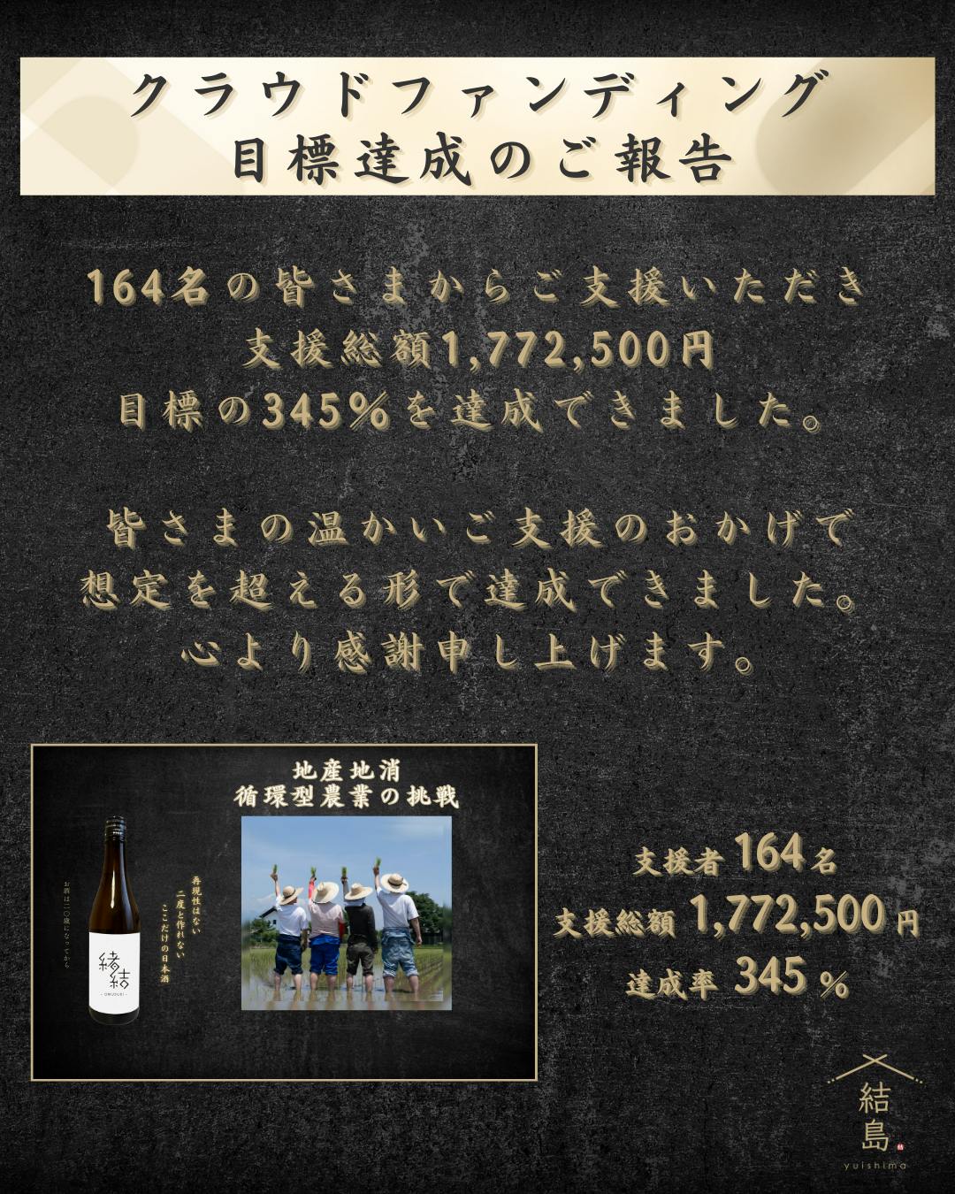 2025/09/07 18:00この度、株式会社結島のクラウドファンディングは2025年8月31日をもって募集終了いたしました。最終的に、164名の方々から合計1,772,500円(目標金額の354%)という大きなご支援をいただきました。ここまで走り抜けることができたのは、ご支援くださった方々はもちろん、さまざまな形で応援してくださった皆さまのお力添えがあったからです。改めて心より感謝申し上げます。今回の挑戦では、群馬・吉岡町で育てたコシヒカリを用い、土田酒造様と共に生酛造りに挑んだ日本酒 「緒結 -OMUSUBI-」 を中心に、循環型農業を軸にしたプロジェクトを進めてまいりました。クラウドファンディングを通じて、多くの方に私たちの想いを届けられたことは大きな励みであり、次の醸造に向けた大きな一歩となりました。リターンの発送や進捗につきましては、改めてご案内いたしますので、今しばらくお待ちください。また、今後の歩みや新たな挑戦についても、活動報告や各種SNSを通じて随時共有してまいります。皆さまの一つひとつの応援が新たな「緒(いとぐち)」となり、共に「結(むす)」ばれ、大きな 「緒結 -OMUSUBI-」 へ育っていくことを願っております。結島は、皆さまと共に築き上げたこの挑戦を、さらに広げ、深めていきたいと考えております。どうぞ引き続き温かく見守っていただければ幸いです。株式会社結島----------------------------------------------------株式会社 結島(ゆいしま)群馬県北群馬郡吉岡町発2024年3月5日設立のスタートアップ結「けっ」して、結「くみたて」て、今までにない新しいプラットフォーム(島)を創る。公式HP:https://yuishima.co.jp/Instagram:@yuishima_incX:@yuishima_inc---------------------------------------------------- もっと見る