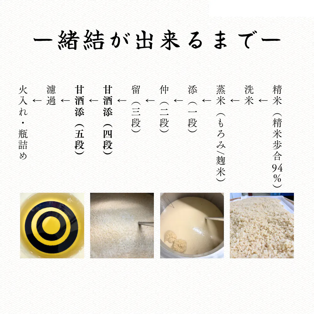 酵母無添加。その他、表示義務のない添加物さえ使用せず、原料米と麹菌のみによる生酛仕込みで製造。さらに、「甘酒五段仕込製法」を用いることで、原酒でありながら、濃い旨み・香り・飲みやすさを実現。精米歩合が高いことから、アルコール発酵速度が速く、旨みや甘みを出しながらの低アルコール調整が難しい中、試行錯誤の末たどり着いた逸品。
