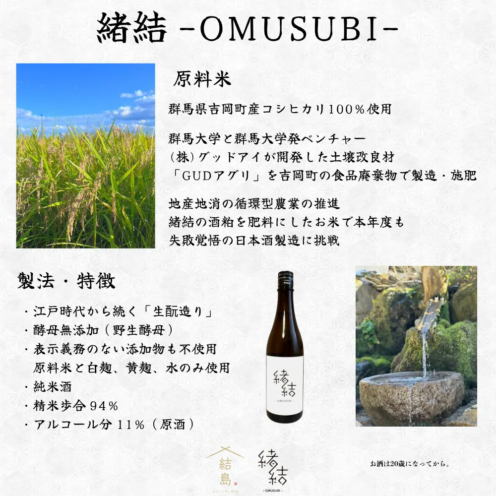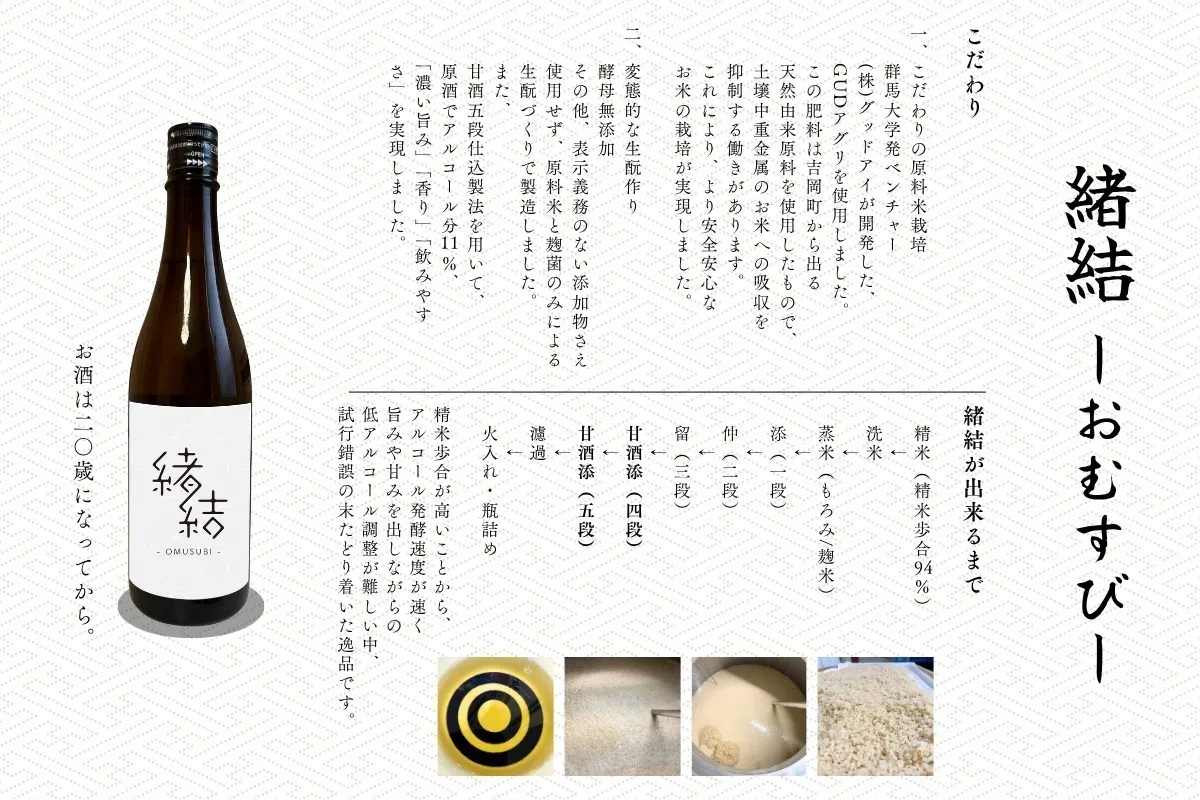 お酒の名前は、緒結。「緒」は、人と人とのつながりの“はじまり”にあるもの。「結」は、”ひとつ”に結ばれること。それぞれが違う場所で、違う毎日を送る中でも、このお酒を通して、何かが“結ばれ、”はじまる”瞬間が生まれてほしい。人と人を、言葉と気持ちを、まだうまく言葉にできない想いさえも、結びつけてくれる。そんな「あたたかさ」を、この一本に込めた。原料米は、利根川が流れる自然豊かな地元「吉岡町」で、土作りからこだわり栽培したコシヒカリ。精米歩合は、ほぼ玄米である前代未聞の94%。ラベルは、情報を削ぎ落としたシンプルなデザイン。日常の“ちょっといい時間”に、すっと馴染む佇まいを目指した。主張しすぎないのに、ちゃんと記憶に残るお酒。日常に追われて疲れている自分を癒したい時や大切な人との大切な時間で「なんか、またあれが飲みたいな」とふと思い出してもらえるような。僕たちは、そんな一本を、届ける。