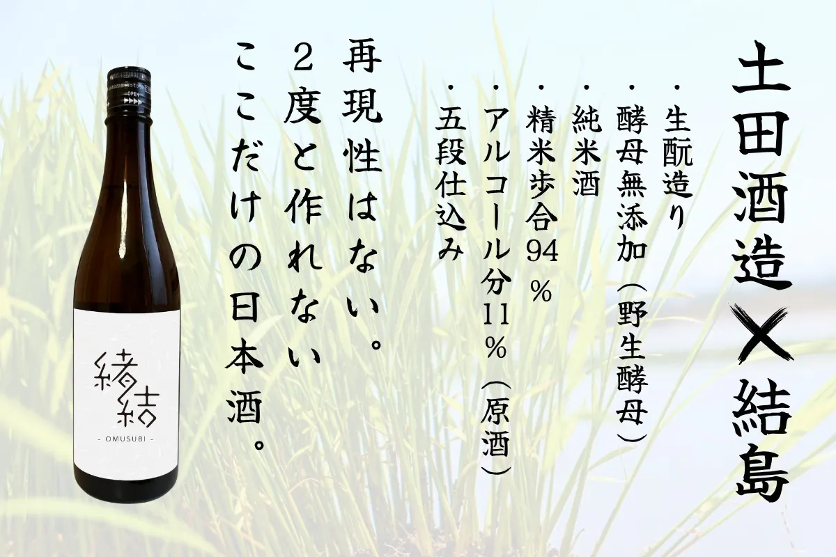 日本酒造りは、通常酒米(さかまい)と呼ばれる一粒あたりの体積が大きく日本酒造りに適しているお米で作られる。僕たちの作っているお米は、ご飯として食べることを目的に作られる飯米(はんまい)である。しかし、飯米で作る日本酒がそもそも市場ではあまり出回っていなかった。そう思っていた矢先、異業種企業懇親会で本当にたまたま声をかけた人物が土田酒造の松田さんだった。松田さんは、「うちは変態的な日本酒を作っている」「他の酒蔵とは違って飯米を使っている」と。「これだ」と思い、「お米作りにこだわっているので、ぜひお酒にしたい」と言ったことが土田酒造との結するきっかけだった。土田酒造は、一言でいえば「自然と向き合うことを恐れない蔵」。化学的な添加物を一切使わず、生酛造りという、江戸時代から続く伝統製法を貫いている。生酛とは、自然界に存在する微生物の力を借りて、じっくりと酒母を育てていく方法。効率化が進む現代の酒造りにおいて、土田酒造はあえて“時間のかかるやり方”を”選び続けている”。手をかけ、待ち、見守る。 発酵の過程を「制御」ではなく、「共生」と捉えるような、人と菌の対話ともいえる酒造り。だからこそ生まれる、深みのある旨み、凛とした旨み、そして土地の個性。それは、「ただ美味しい酒」ではなく、“生きているような酒”だった。僕たちは初めてその味に触れたとき、「ああ、これが“土地を飲む”ってことなんだ」と腑に落ちた。杜氏 星野さんとの対話の中で、こんな言葉があった。「土田の酒は、美味(うまい)じゃない。旨い(うまい)なんだよ。その言葉に、僕たちは心を動かされました。大切なのは、効率ではなく、納得のいくものをつくること。科学や合理性を知っているからこそ、あえて非効率な道を選ぶ強さと優しさ。それは、僕たちが目指したい在り方とも重なっていた。土田酒造の挑戦と僕たちの挑戦が共鳴し、結島と土田酒造が結した。