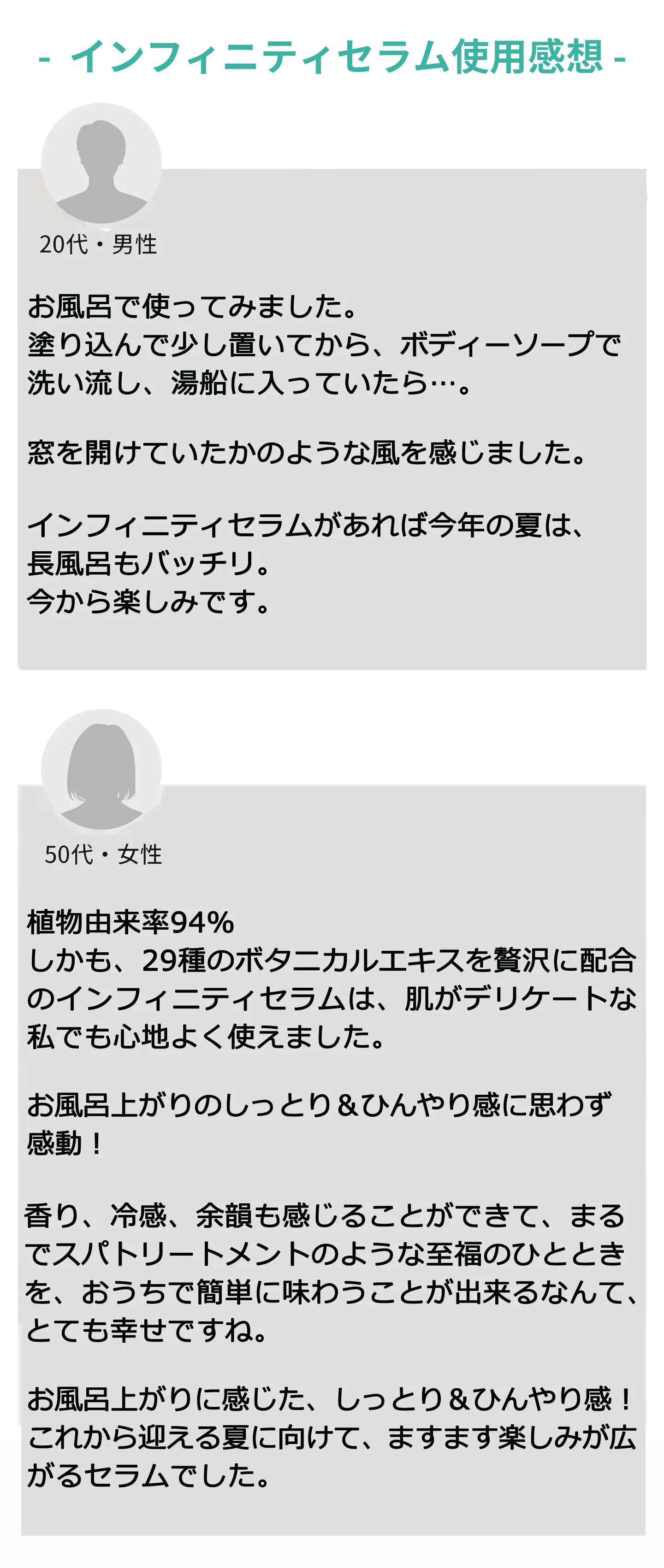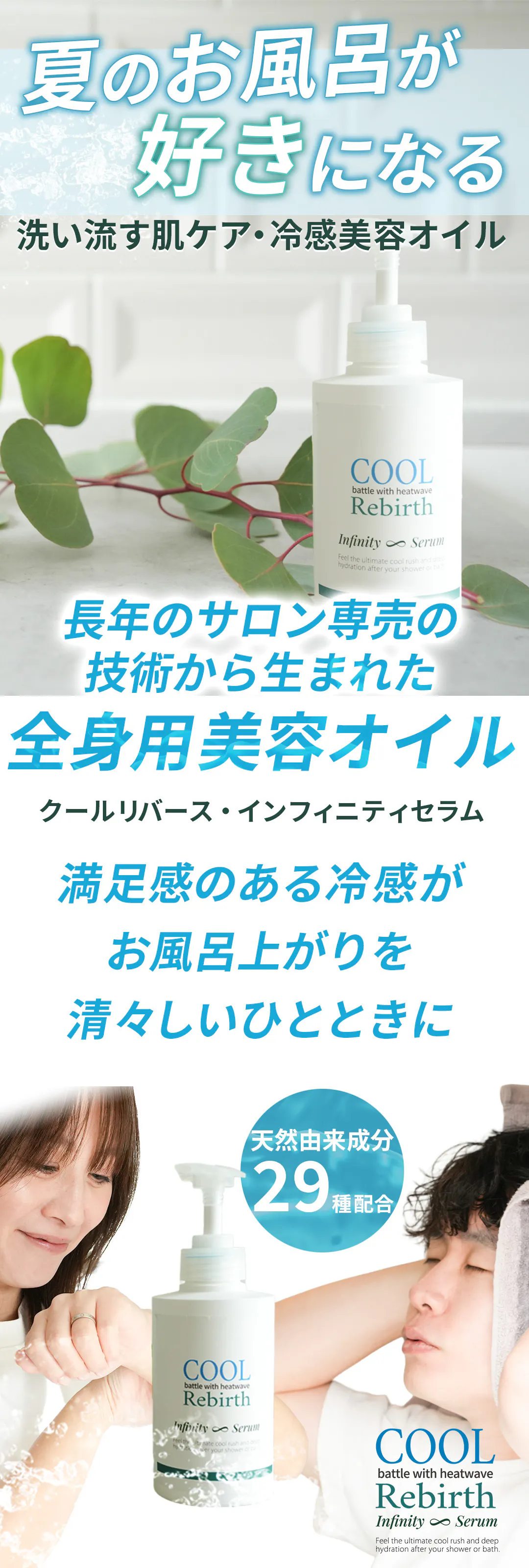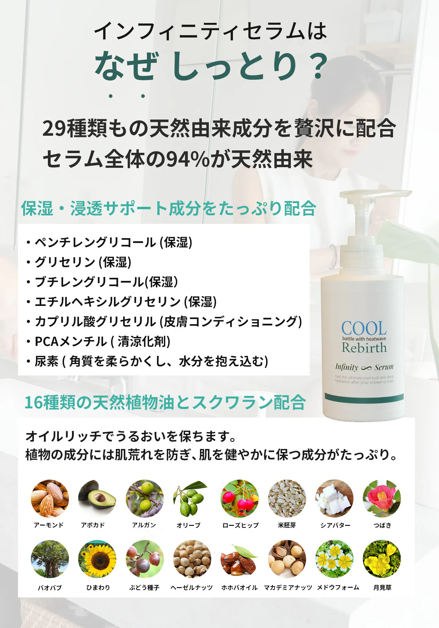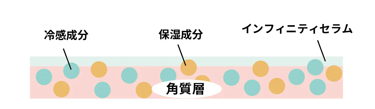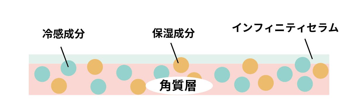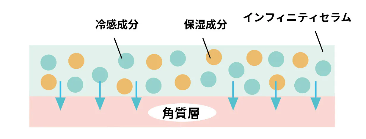 『インフィニティセラム』は、セラムの中に含まれるオイル成分が冷感成分を包んで肌にとどめ、セラムごと角質層に浸透、肌になじんで保湿成分と冷感がとどまります。