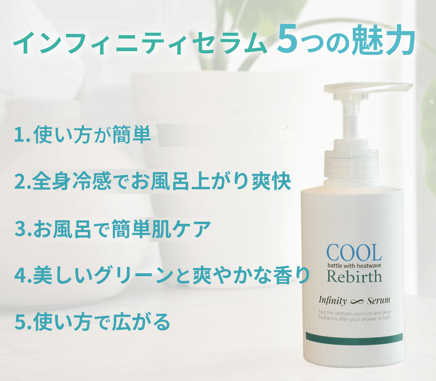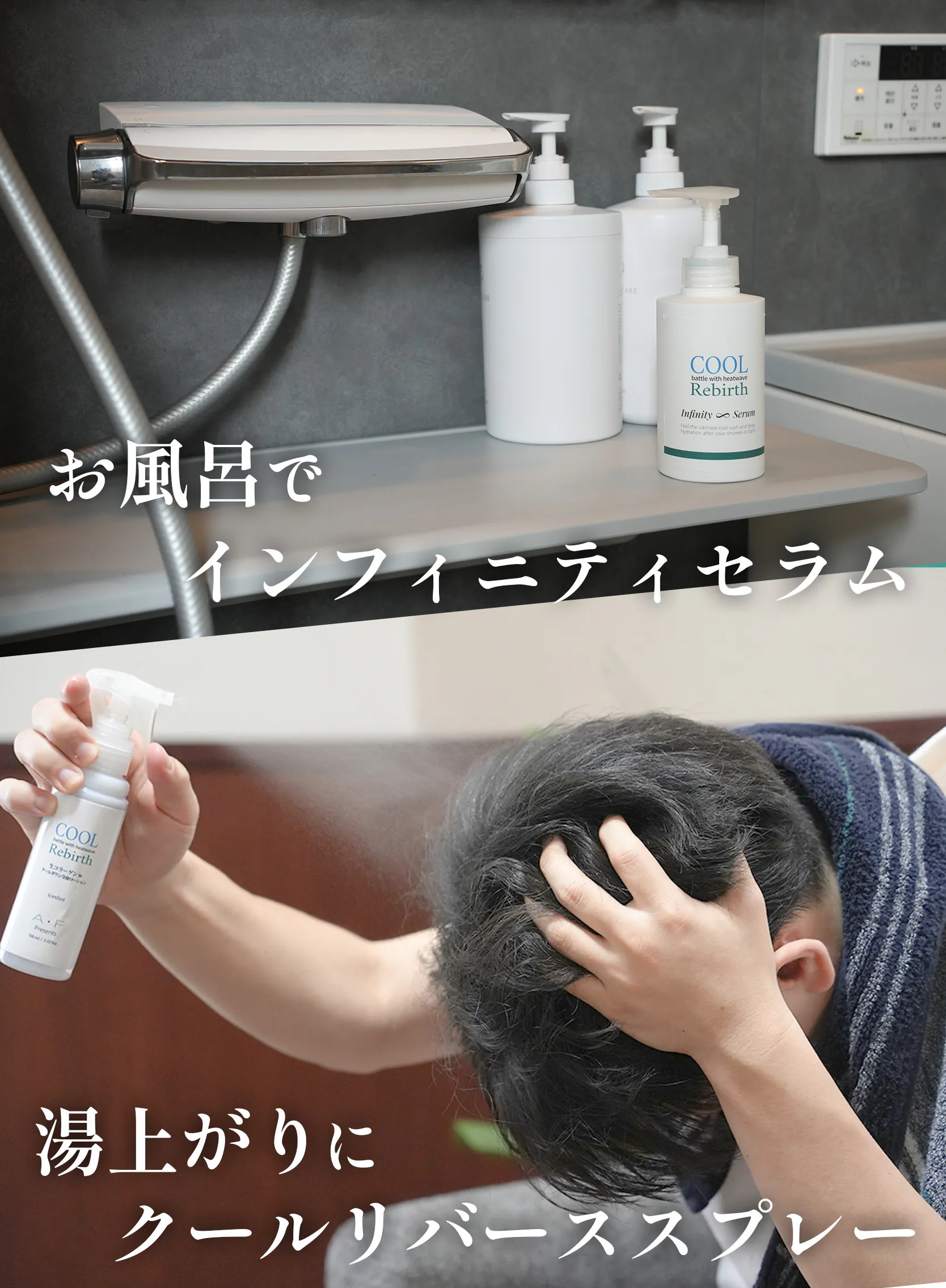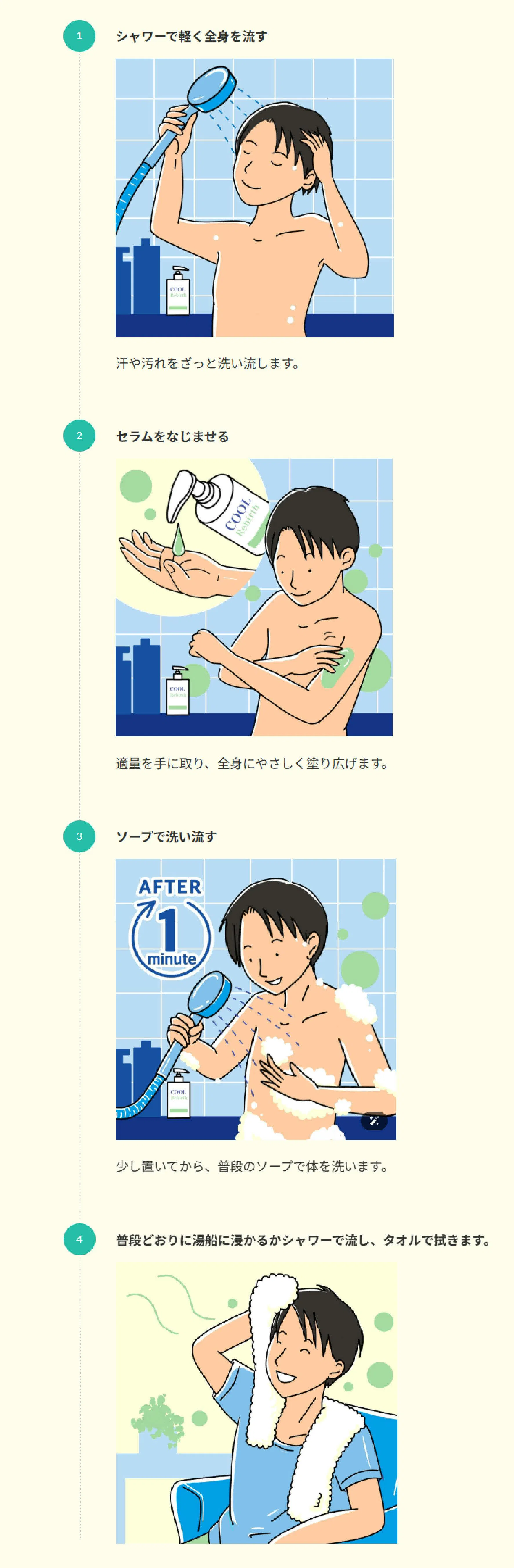 まずよく塗り込み、お風呂で洗うときの摩擦で、肌の角質層にセラムがしっかりなじむため、冷感が安定します。