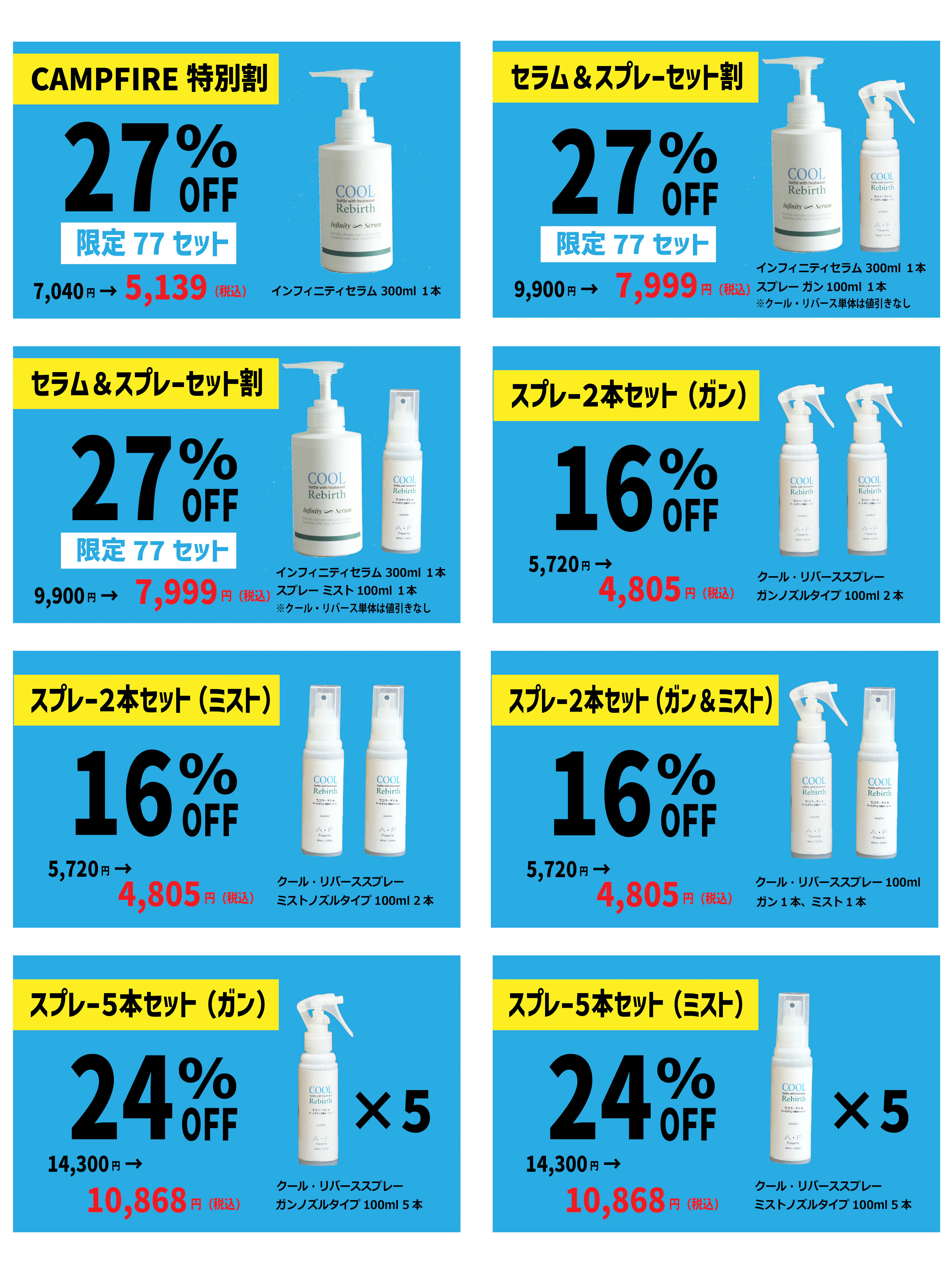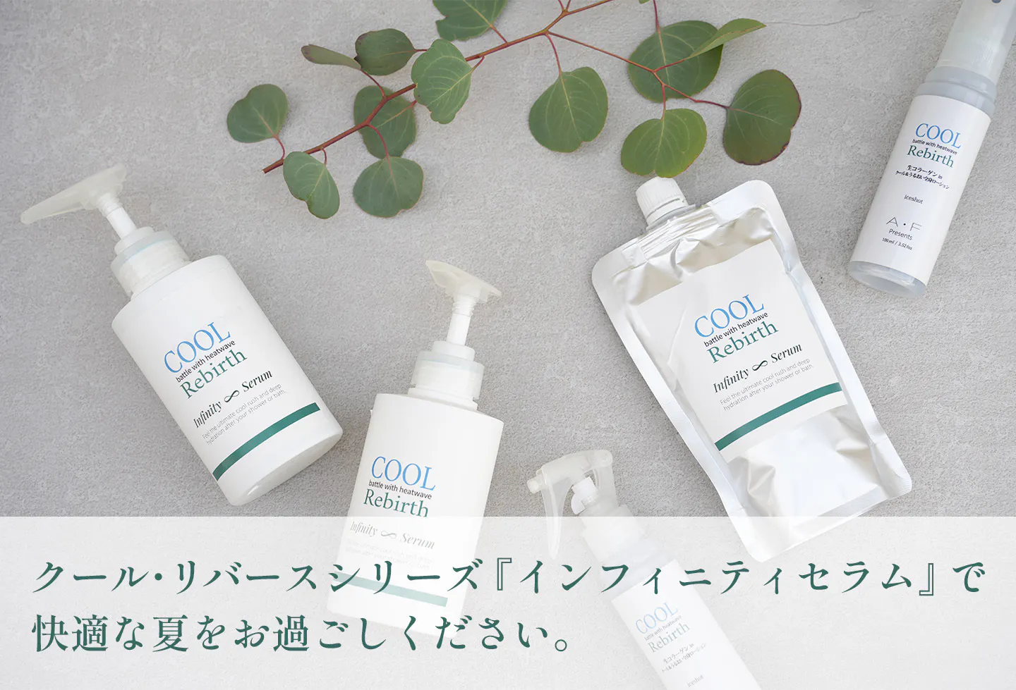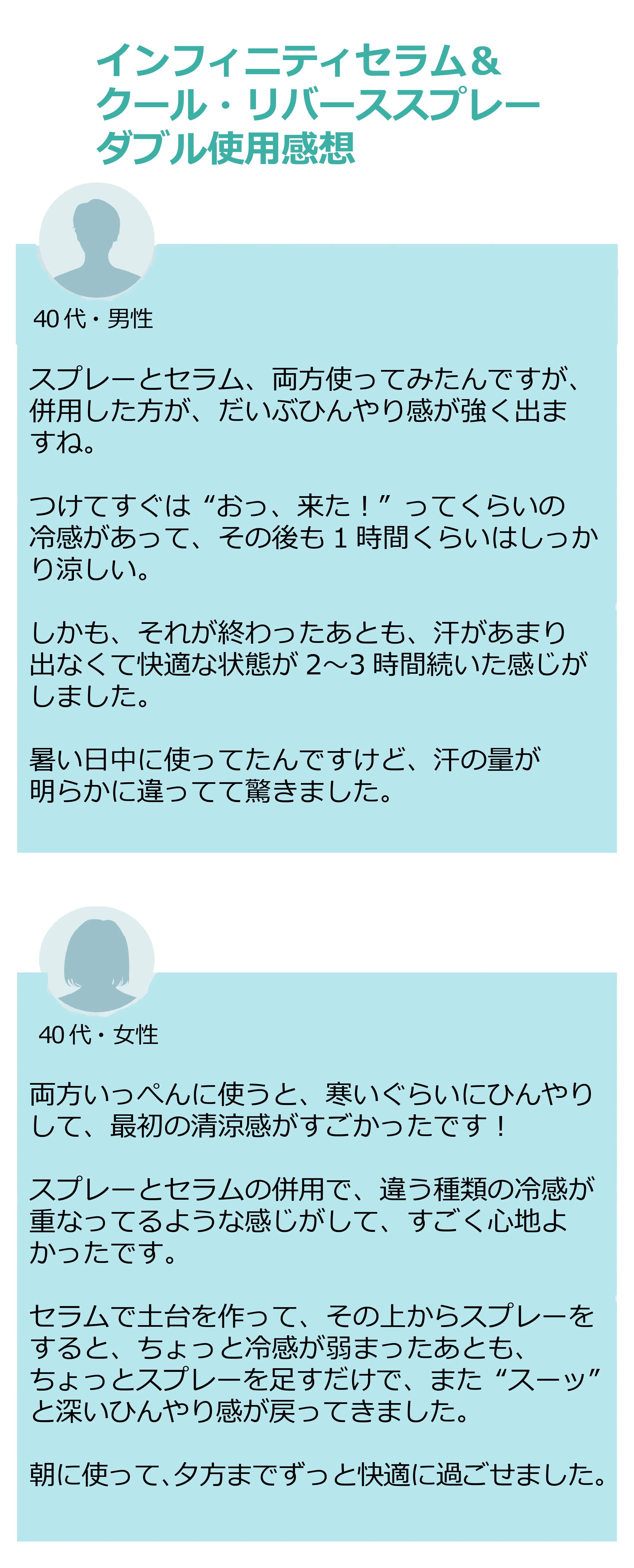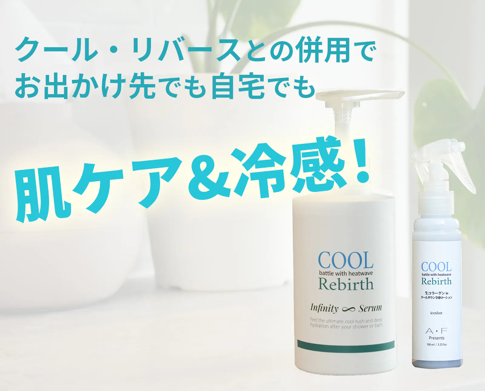 さらに、昨年ご好評いただいた新時代の肌ケア&冷感スプレー『クール・リバース』を一緒に使うと、セラムとスプレー、異なる冷感の相乗効果が出て、清涼感がパワーアップします