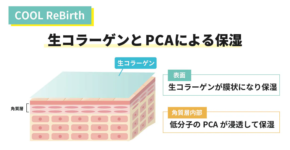 ※生コラーゲンとは、加水分解していない高分子のアテロコラーゲンのことを指します。全成分表示にも「アテロコラーゲン(保湿剤)」として記載されています。