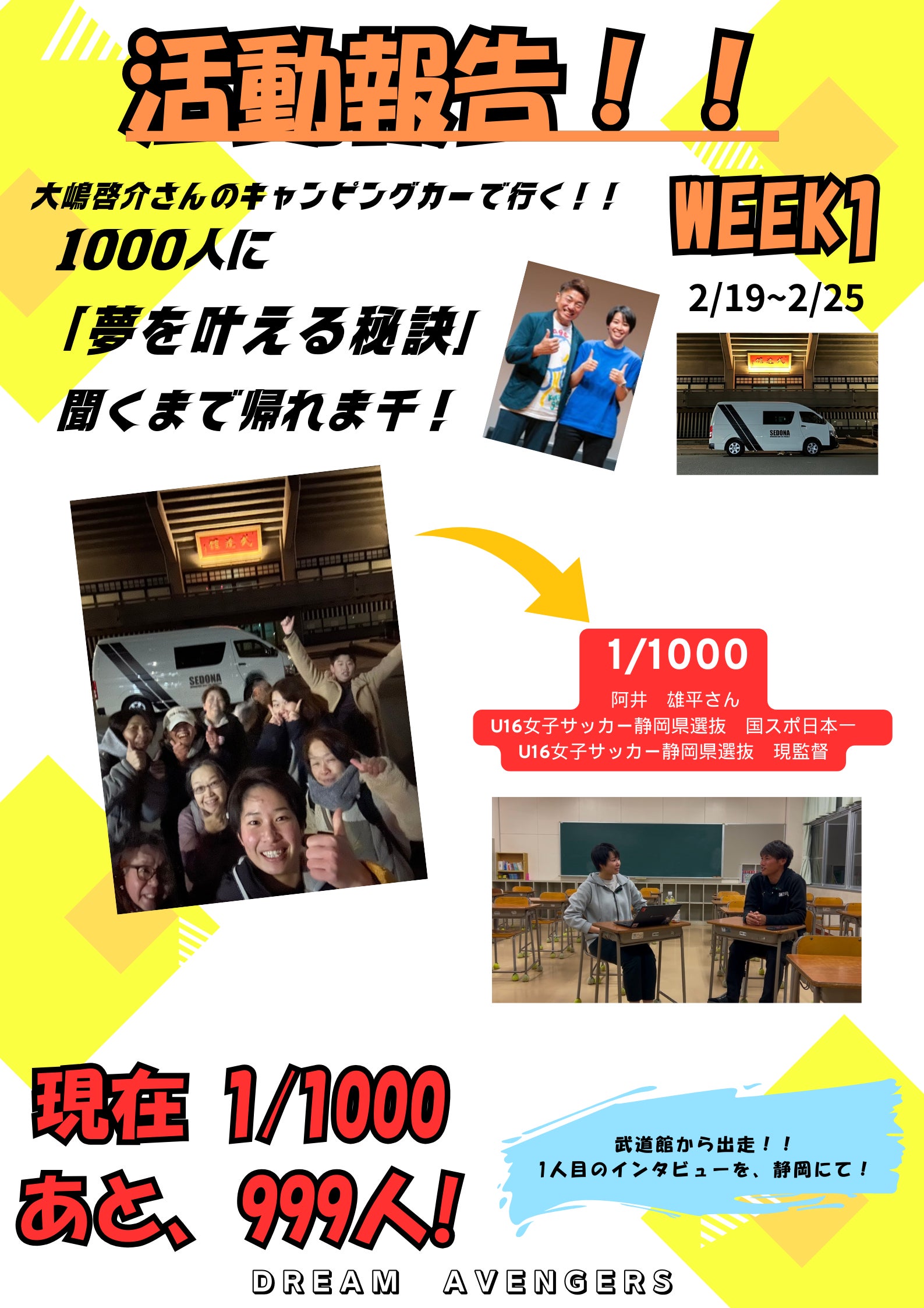 2025/09/30 11:30皆様、本日まで、活動報告を読んでくださってありがとうございました。これが最後の活動報告となります。まずは、多くの方々にリターン購入して頂き、誠にありがとうございました。そして、準備段階から最終日まで、次々と送っていただきました応援メッセージ本当にありがとうございました。毎日丁寧に読ませて頂き、その想いに感動し、めちゃくちゃ励みになりました。本当に本当にありがとうございました。それではDREAM AVENGERSリーダー吉澤優貴から皆様へ『感謝の想い』お送りいたしますキャンピングカー生活を始めてから223日目が経ちました。長かったようであっという間の223日。1000人インタビューは、まだまだ道半ばですが、今日はクラファン最終日、一区切りということでここまでの思い出と感謝を書き記しておこうと思います。いつもより少し長文になります。ご容赦ください。------------ーー2025/2/9大嶋啓介さんからキャンピングカーを受け取り、2025/2/19私たちDREAM AVENGERSの聖地日本武道館から出走しました。寒空の下、大切な仲間たちに見送られ、ワクワクと少しの寂しさを感じながら日本武道館を出発したのを覚えています。当初は、中々アポイントが取れず、インタビューは1週間に1度ほど…途方もない1000という数字を後悔した日もありました。途中、タイヤがパンクしたり、ガス欠になったり、仮眠をしていたら警察に通報されたり…凍える寒さにカイロを貼っていた頃から暑さで眠れない夜を越え、金木犀の香りを感じる季節となりました。沢山の方のお力添えで、ご縁や応援を頂き、168人もの方にインタビューをさせて頂けました。本当に本当にありがとうございます。168人の間には、インタビューはしていなくても、力や知恵を貸して下さった方、ご縁を繋いで下さった方、応援の言葉を下さった方など、本当に沢山の方が支えて下さいました。夢を見て、挑戦することは、正直簡単な事ばかりではないと思います。この挑戦でも、うまくいかない事はたくさんありました。きっとこれからも、沢山の壁にぶち当たると思っています。でも、168人の輝く大人の皆さんが口を揃えて教えて下さったことがあります。諦めない限り、夢は続くと。失敗は、経験であり、成功への道だと。たった1人から始まった1000人インタビューに、今や、沢山の人達の希望がのり、1000人達成を共に喜んで下さる人の姿が、数えきれないほど浮かびます。私達は、そんな沢山の同志の皆さんと共に、最高の生き様を届けるため、これからも挑戦し続けます。私には好きな言葉があります。『純粋さの勝利を信じろ』結婚式場で働いていた時、とある会社の社長さんのコラムで拝見した言葉です。大好きなコラムから一部抜粋して紹介させて頂きます。『純粋に世界をよりよくしたいという願いを抱き 挑戦し続ける人生に終わりはない多くの人は、途中でそれを諦める 諦めに気がつかず自分に言い訳をしてごまかす それが、大人になるってことなんだとか言って大好きな漫画の主人公がいつも問いかけてくる 「純粋さの勝利を信じろ」と 確かに、現実世界で信じ続けるには勇気が必要だ それでも僕は駆け引きをせず、純粋さの勝利を信じる 理想を追求して新しい価値をこの世界に生み出すさぁ、勇気を出して表現し続けよう 純粋さの勝利を信じて』この1000人インタビューを通じて、沢山の輝く大人の皆さんに出会わせて頂きました。日本の未来は明るいと、何度も思わせて頂きました。本当にありがたいことだと思っています。1000人の想いと生き様を、次世代へ届けるため私達は、これからも走り続けます。『志をともに、願いを勇気に』夢とは、自らの可能性を輝かせるもの夢とは、今を生きる原動力になるもの夢とは、仲間と共に叶えるものたった一人の一歩が、勇気になる。たった一人の信じる力が、未来を創る。私達DREAM AVENGERSは、『夢』と『仲間』の力で、1人1人の人生に圧倒的感動を創ります。クラウドファンディングを応援して下さった皆様。本当にありがとうございます!皆さまからの応援を力に変えて、1000人達成に向けて、邁進して参ります!今後ともどうぞよろしくお願い致します!吉澤優貴DREAM AVENGERS 1000人インタビューの軌跡本日も最後まで読んで頂きありがとうございました♪皆様の応援が私達の励みとなっています♡その想いは1000人インタビュー達成までその後の私たちDREAM AVENGERSの夢への応援へと繋がっていきます。志をともに願いを勇気に夢と希望が持てる社会を作るために活動報告担当 DREAM AVENGERS 背番号19 番 ホッシーこと星野麻衣子 もっと見る