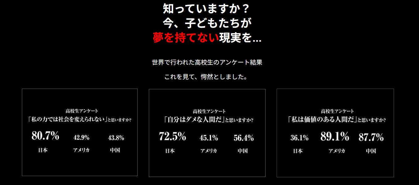 その中で、沢山の高校生や中学生にお会いする中で、将来への不安を抱え、未来に希望を持てない人や、夢がない人が沢山いることを知りました。