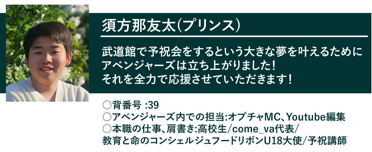 自己紹介:神奈川県横浜市在住の高校3年生で、「若い人たちの自殺をゼロにする」という夢を胸に、全国で講演活動を行っています。講演テーマは、「寄り添う力が奇跡を起こす!」。自身の苦しかった経験から、「寄り添うこと」が命を救う力になると確信し、行動を続けてきました。現在は、予祝講師としての講座・事業をはじめ、講演サポート事業/出張料理店/キッチンカー/Canva作成代行事業など、多角的に展開中しています!「教育者といえば須方那友太!」と世界中で呼ばれる存在になることが目標です!