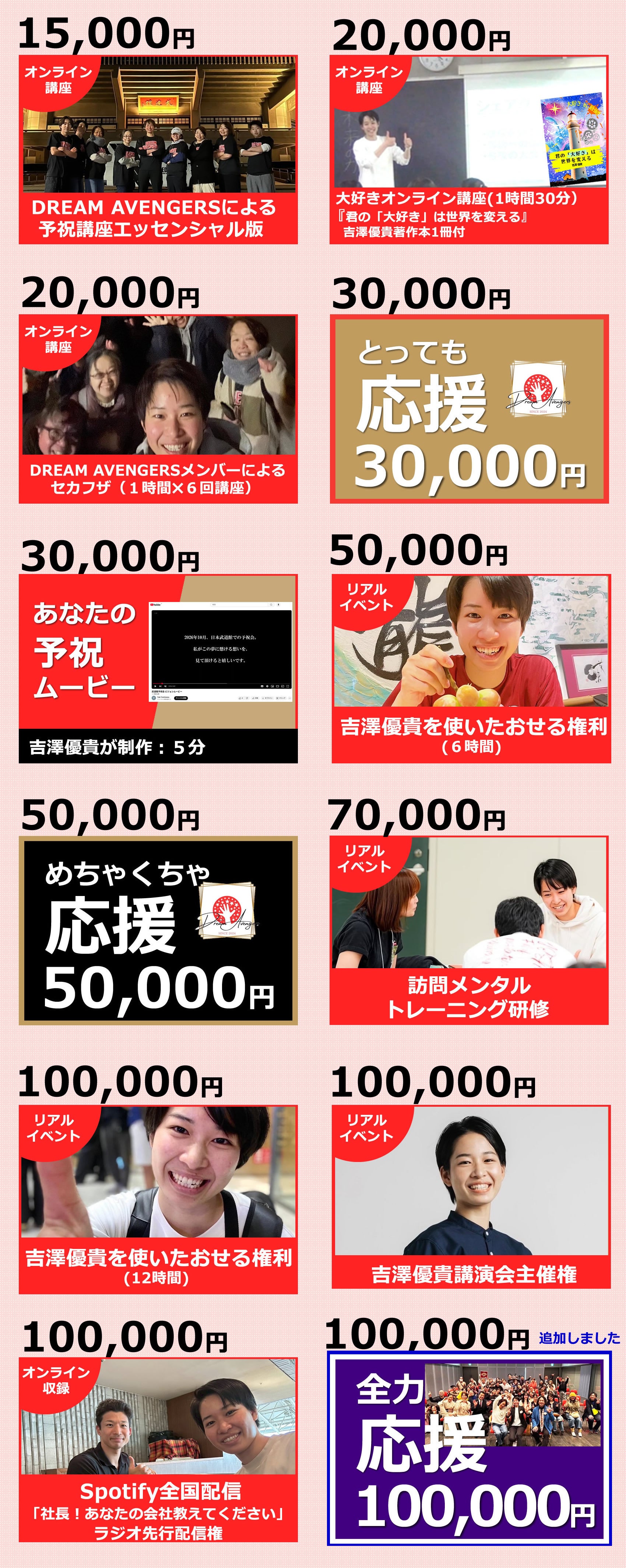 2025/10/02 06:30目標額達成!!ありがとうございました♡リーダー吉澤は、日々1000人インタビューに挑み続けその歩みはクラウドファンディングの期間中も止まることはありませんでした。その挑戦を支えてくださったのは、寄り添い、共に歩んでくださった支援者の皆さまです。いただいた応援の言葉、想いの一つひとつに大きな愛が込められているのを感じました。その愛は私たちに勇気を与え、希望を灯しこれからも挑み続ける力となりました。これまでに寄せられたご支援と想いがあったからこそ、ここまで歩んでくることができました。今日までつながったすべての出会い、すべての応援に、心から深く感謝申し上げます。私たちは、この愛と感謝を胸に、これからも皆さまと共に希望にあふれる未来をつくっていきます。リターン『グッズ・書籍・カレンダー』は順次発送して10月中にはお手元に届くようにいたします。『ただただ応援・とっても応援のメールそして手紙』も10月中にお届けいたします。『初講演会アーカイブ』のリンクとパスワードも10月中にメールにてお届けいたします。『予祝オンラインインタビュー・星の窓カウンセリング』は個別にご連絡し日程調整をいたします。『オンライン交流イベント・餃子会』10月中を予定しております。『オンライン講演会』は開催日時前日までにURLをお送りいたします。おって連絡いたします。2日程のどちらかを選びご連絡の際、お伝えください。『てっぺんツアー』は参加予定の皆様とライングループを作成します。11月初旬の開催を予定しております。『予祝ムービー』10月中に吉澤からご連絡いたします。イメージを膨らませてお待ちください。『吉澤優貴講演会主催権』10月中にご連絡いたします。本日も最後まで読んで頂きありがとうございました♪皆様の応援がどれだけ私達の励みとなり支えていただいたことか!!志をともに願いを勇気に夢と希望が持てる社会を作るためにこれからも頑張ります!!活動報告担当 DREAM AVENGERS 背番号19 番ホッシーこと星野麻衣子でした。ありがとうございました♡ もっと見る感謝を込めて