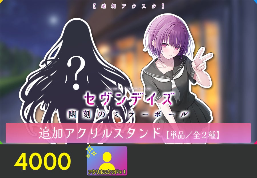 『セヴンデイズ 幽刻のミラーボール』プロジェクトへのご支援・応援をありがとうございます。 目標額達成の記念として、『追加アクリルスタンドコース』を設定いたしました。 新規描き下ろしの千夜子と、CF達成イラストの紫、それぞれをアクリルスタンド化したアイテムになります。◆追加リターン概要【 追加アクスタ 】『セヴンデイズ 幽刻のミラーボール』追加アクリルスタンド(全2種)・デザイン:千夜子<新規描き下ろしVer.>/紫<CF達成ピース>・コース価格:4,000円 ご興味をお持ちいただけましたら、プロジェクトページのリターン一覧より詳細をご確認いただけますと幸いです。 引き続き『セヴンデイズ 幽刻のミラーボール』をどうぞよろしくお願いいたします。LIFE0運営