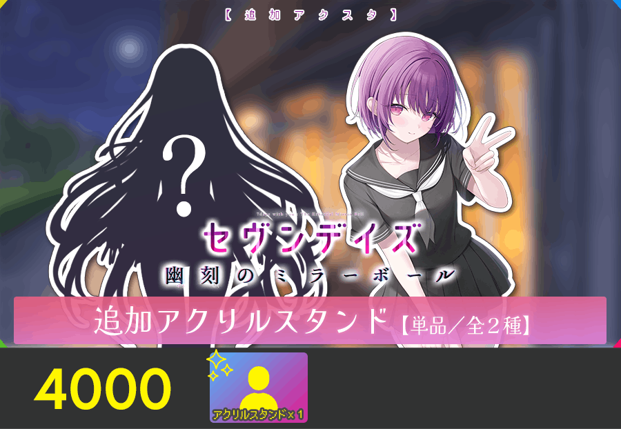 【 幽刻アクスタコース 】に加え、『セヴンデイズ 幽刻のミラーボール』のアクリルブロック(100×150mm予定)をお届けするコースです。