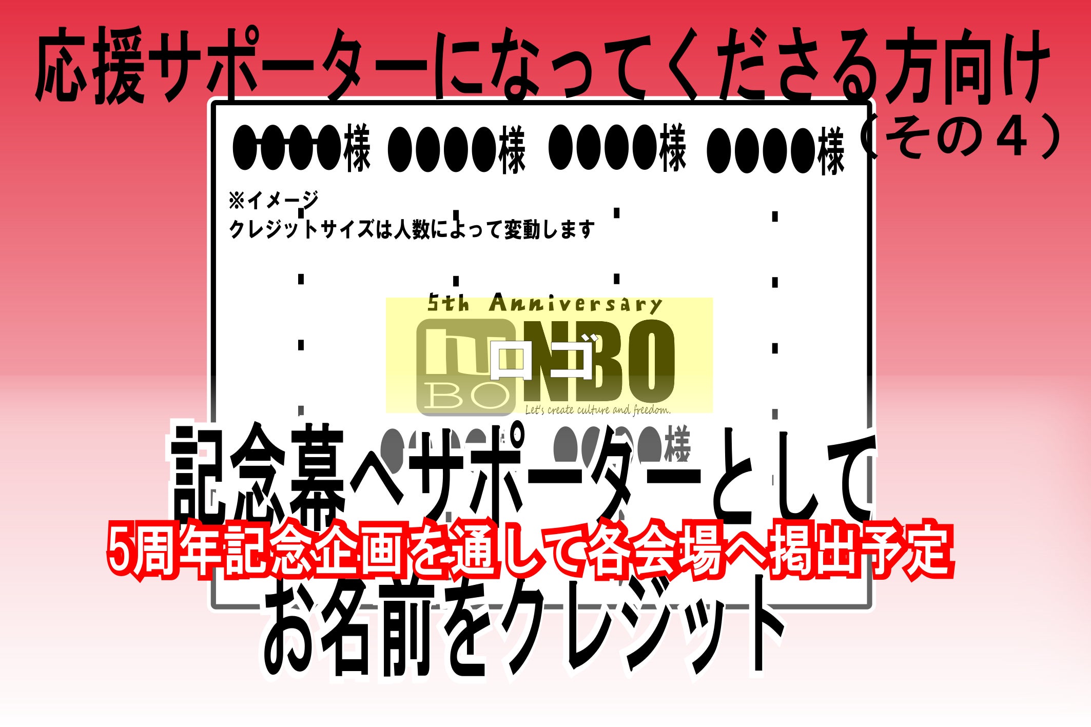 NBO5周年記念企画実施時に各会場へ掲出予定の記念幕へサポーターとしてお名前またはニックネームを掲載します。